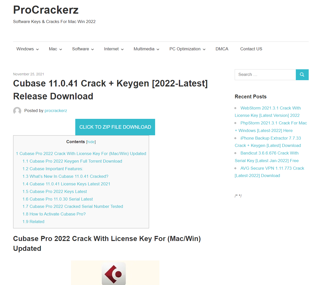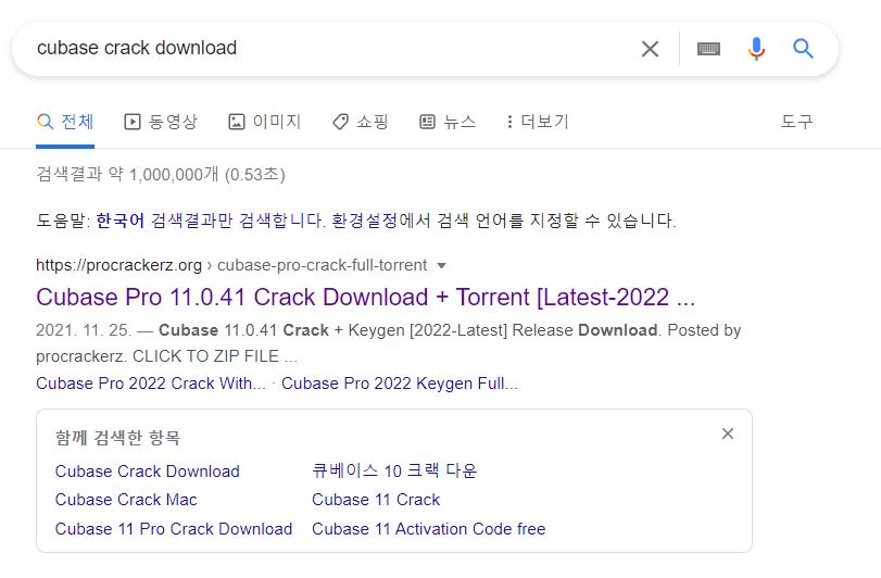 악성파일의 예를 들면, 우리는 무료로 필요한 파일을 찾을 때 인터넷 검색을 하여 블로그나 왠지 정보가 있을 것 같은 사이트를 들어갑니다. 큐베이스 프로그램을 찾기 위해 인터넷에 큐베이스 크랙 다운로드를 영어로 검색해봅니다. 그러면 아래 그림처럼 검색 결과가 나오고, 우리는 그 검색 결과를 접속합니다.