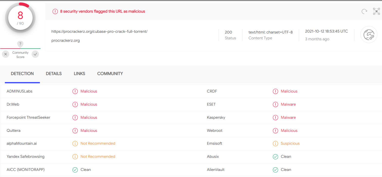 이 결과에 따라, 악성이 있다면 빨간 글씨로 몇 개의 백신업체에서 악성으로 판단했는지가 나오고 보통 1~2개의 백신업체에서 진단한 것은 아주 심각한 악성코드가 아니고 광고 행위 정도 하는 악성코드 일 가능성이 높습니다. 하지만, 아래 그림처럼 8개 정도 나오는 것은 사용을 안 하시길 권고드립니다.