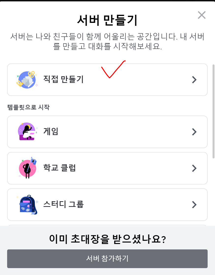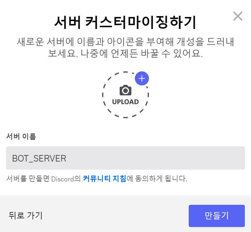 이제 디스코드 프로그램을 실행시켜서 서버를 만들고, 봇을 초대해야 합니다. 디스코드에서 좌측하단에 플러스 버튼을 눌러 서버를 만들어 주세요. 아래 그림 순서대로 따라 하시면 됩니다. 이름은 편한 걸로 해주세요.