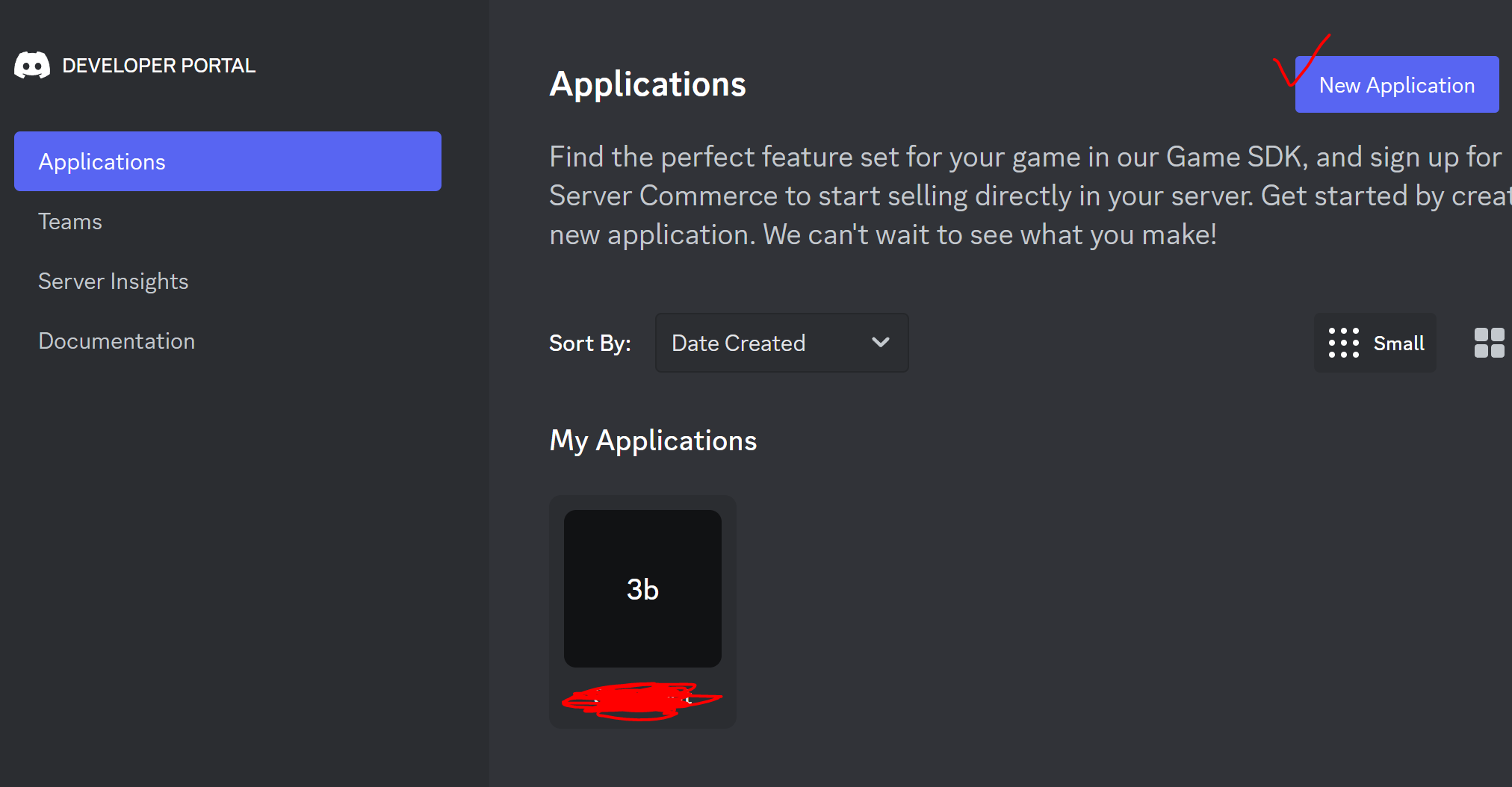 아래 사이트에 접속합니다. 접속해서 우측 상단에 New Application 버튼을 눌러서 아래와 같이 Application을 만들어줍니다. 여기서 Application은 디스코드 봇을 관리하는 상위 개념입니다. 다음에 Application 안에서 Bot을 생성할 것입니다.