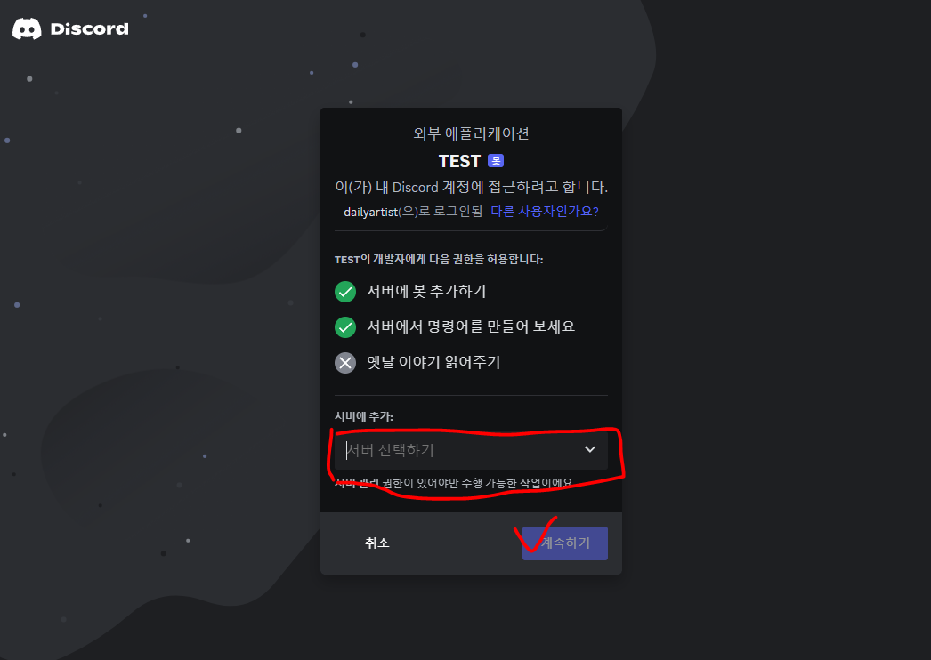 그다음에는 서버에 추가 항목에 방금 위에서 만들어둔 서버를 눌러서 Bot을 초대합니다. 여