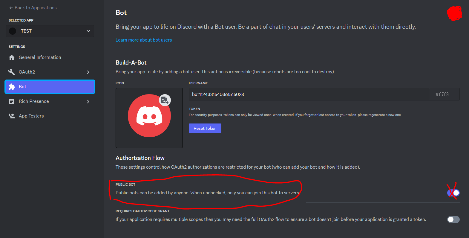 Application을 생성한 후에는 디스코드 봇 생성을 위해 왼쪽 메뉴에 Bot을 눌러줍니다. 그러면 PUBLIC BOT이라는 항목이 체크가 되어있는데, 나 말고도 다른 사람들에게 봇을 공유하고 싶으면 오픈하면 됩니다. 그게 아니라면 해당 항목을 비활성화해주세요.