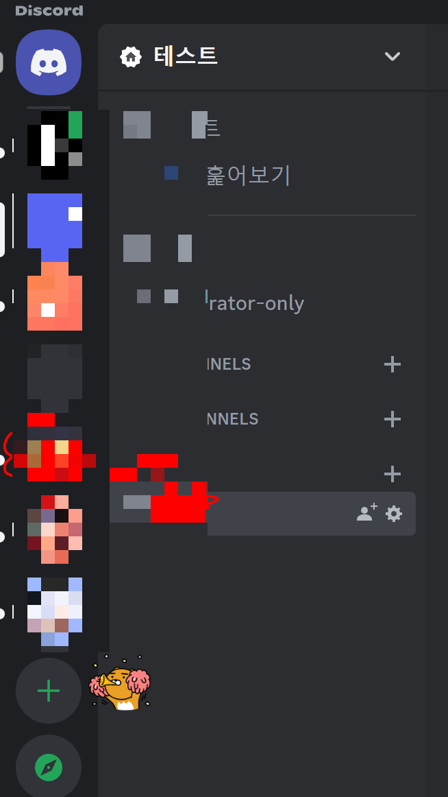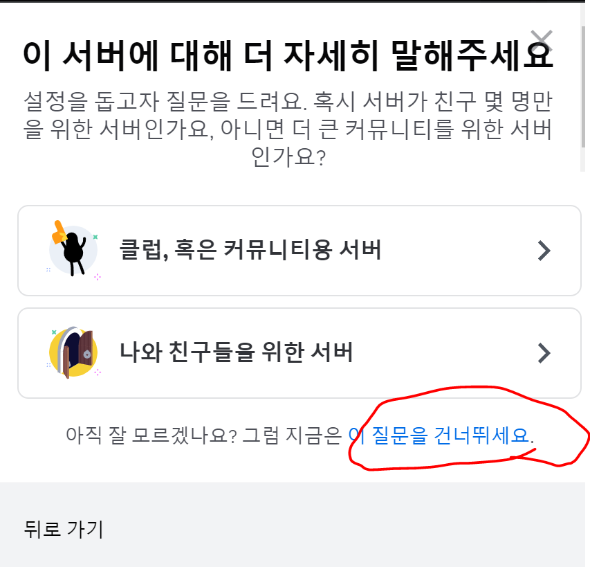 이제 디스코드 프로그램을 실행시켜서 서버를 만들고, 봇을 초대해야 합니다. 디스코드에서 좌측하단에 플러스 버튼을 눌러 서버를 만들어 주세요. 아래 그림 순서대로 따라 하시면 됩니다. 이름은 편한 걸로 해주세요.
