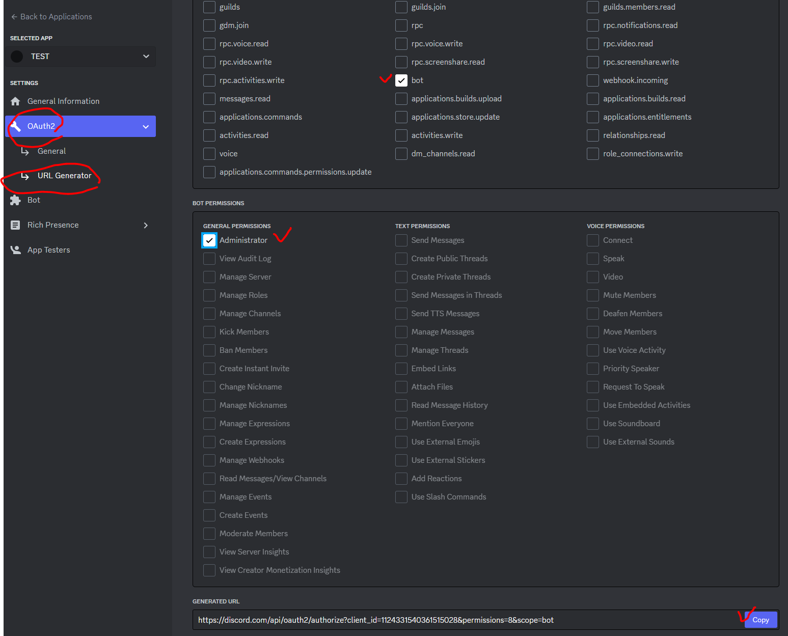 미리 만들어둔 서버에 Bot을 추가하는 작업을 해보겠습니다. 다시 아래 사이트로 접속해서 OAuth2 > URL Generator 화면에서 bot, Administrator를 클릭하고 우측 하단에 Copy 버튼을 눌러서 브라우저 창에 붙여 넣어주세요.