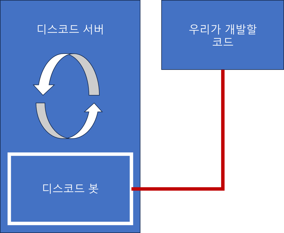 여기까지 하면 디스코드 봇을 만들 준비가 완료되었습니다. 봇 동작 원리에 대해 간단하게 설명하고 글을 마무리하도록 하겠습니다. 디스코드 봇은 디스코드 서버에 종속되어 서버와 우리가 개발할 코드의 중간 역할을 하는 것입니다. 그래서 이어서 할 코딩은 봇에 통신을 요청하고 봇이 디스코드 서버에 데이터를 요청해서 받아오는 개발할 할 예정입니다.