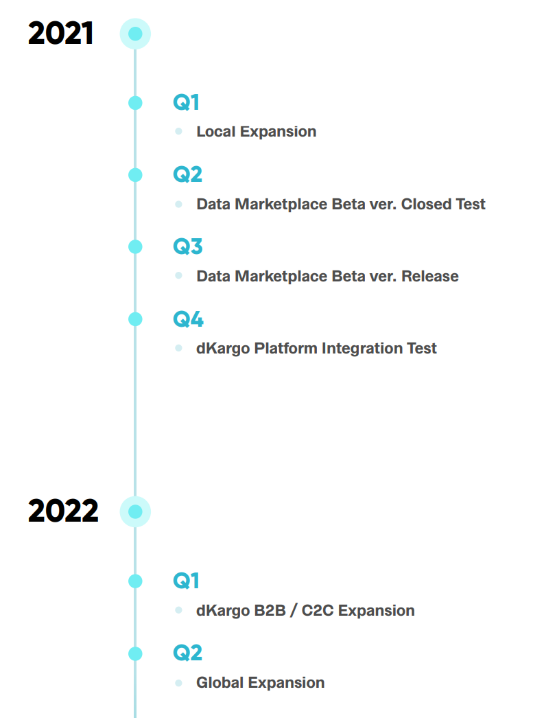 디카르고의 사업 계획은 공식 홈페이지와 홈페이지 내 Docs 파일로 제공하고 있습니다. 디카르고 투자에 관심이 있으시다면 시간 내어 자세히 읽어보시는 게 좋겠습니다. 이 디카르고 프로젝트 문서에서 주목해서 봐야 할 것은 프로젝트 로드맵입니다. 위에 설명드린 상황과 디카르고 호재 시기가 맞아떨어지는 것으로 보입니다.