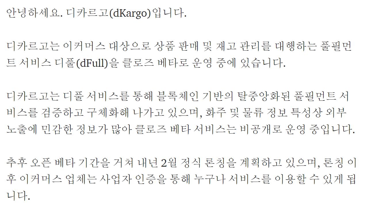 이 글은 작년 11월 10일 글이고, 왜 디카르고 서비스는 오픈된 깃허브를 사용하지 않고 있는지와 계획에 대해 설명하는 내용이 있습니다. "내년 2월 정식 론칭을 계획하고 있으며, 론칭 이후 이커머스 업체는 사업자 인증을 통해 누구나 서비스를 이용할 수 있게 됩니다." 이 글과 위에 적어둔 글들의 내용을 종합해보면, 물류 문제성의 대두, 카카오 물류사업 진출, 관련 프로젝트 디카르고 시장 출시 예정은 2월. 이 정보들을 미루어 볼 때 충분히 기대감을 형성할 수 있다고 생각하고 이것이 디카르고 호재로 작용될 것으로 보입니다. 실제 시장이 생각대로 움직이진 않겠으나, 충분히 투자할만한 가치가 있는 프로젝트라고 생각하고 있습니다. 디카르고에 투자하시는 분들 또는 하려고 관심을 가지고 계신 분들에게 좋은 글이 되면 좋겠습니다.