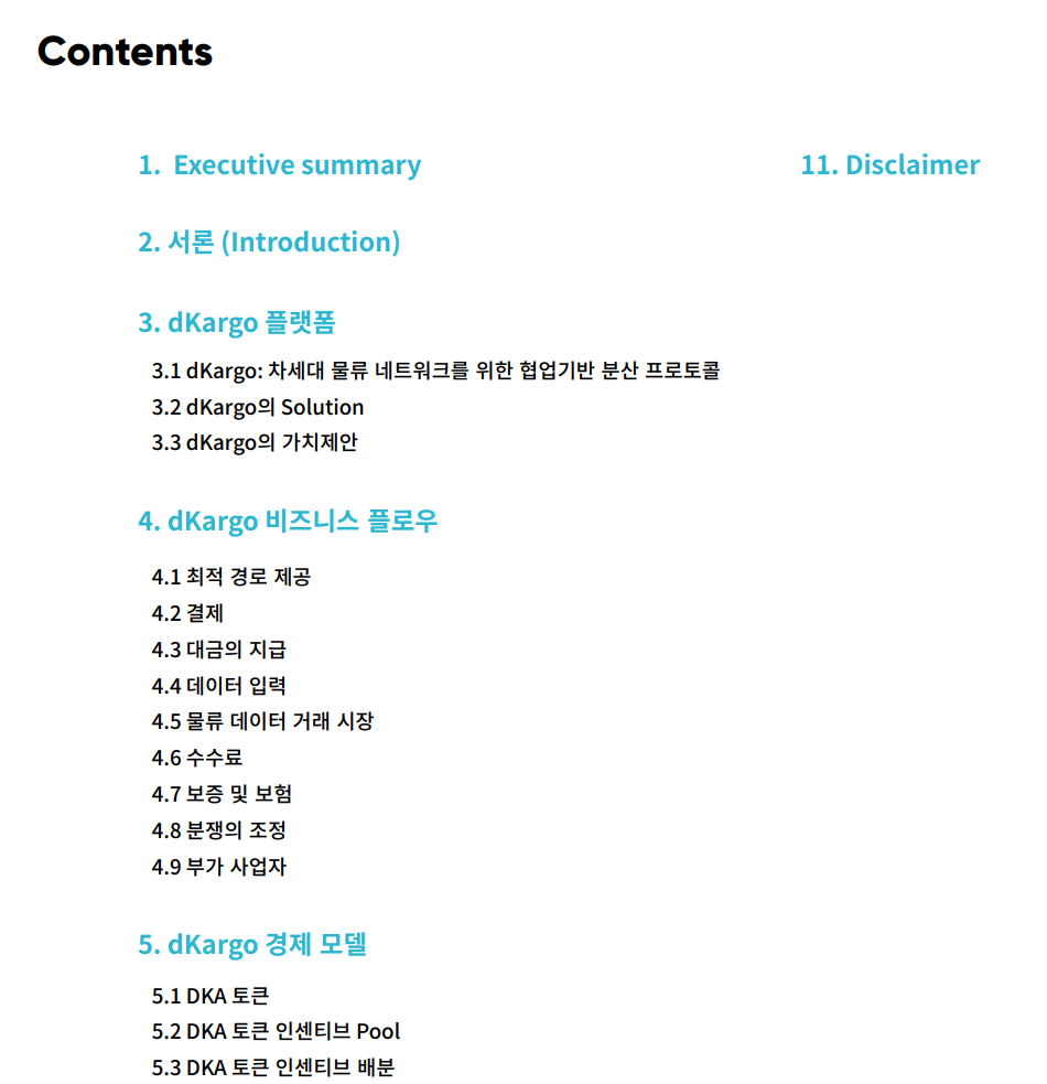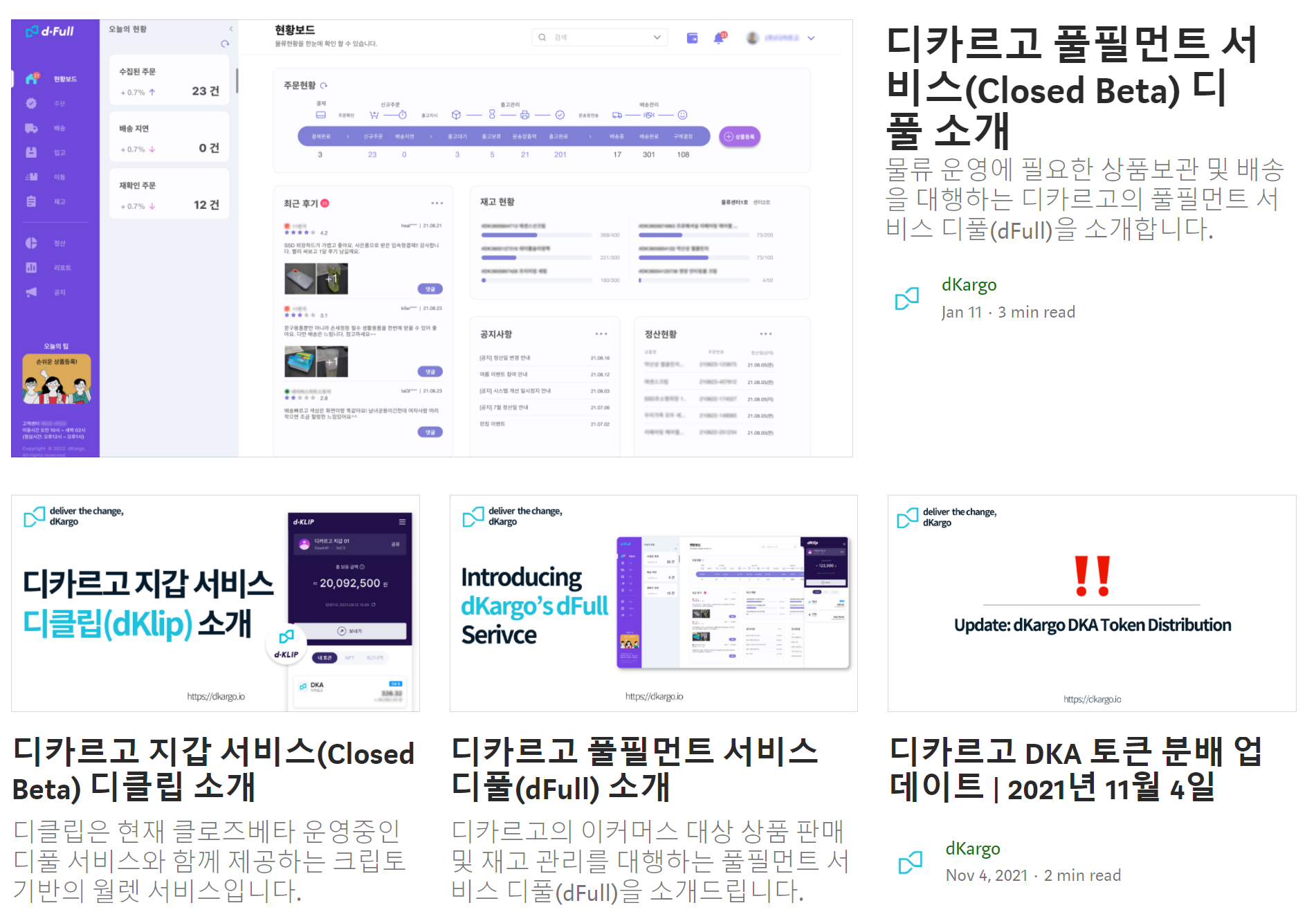 이 글은 작년 11월 10일 글이고, 왜 디카르고 서비스는 오픈된 깃허브를 사용하지 않고 있는지와 계획에 대해 설명하는 내용이 있습니다. "내년 2월 정식 론칭을 계획하고 있으며, 론칭 이후 이커머스 업체는 사업자 인증을 통해 누구나 서비스를 이용할 수 있게 됩니다." 이 글과 위에 적어둔 글들의 내용을 종합해보면, 물류 문제성의 대두, 카카오 물류사업 진출, 관련 프로젝트 디카르고 시장 출시 예정은 2월. 이 정보들을 미루어 볼 때 충분히 기대감을 형성할 수 있다고 생각하고 이것이 디카르고 호재로 작용될 것으로 보입니다. 실제 시장이 생각대로 움직이진 않겠으나, 충분히 투자할만한 가치가 있는 프로젝트라고 생각하고 있습니다. 디카르고에 투자하시는 분들 또는 하려고 관심을 가지고 계신 분들에게 좋은 글이 되면 좋겠습니다.