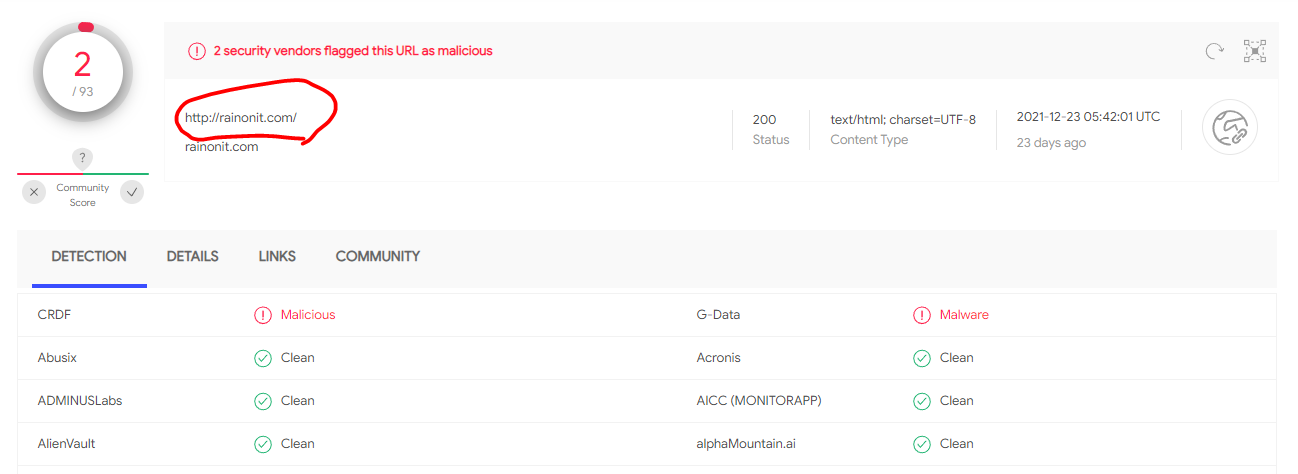 rainonit 닷컴은 2개의 악성 진단, rainonit닷컴 뒤에 /3UJE를 붙여서 조회해보면, 1개의 악성 진단이 나옵니다. 이렇게 뒤에 어떤 문자가 붙는지에 따라서도 악성 진단이 달라진다는 것을 확인해보았습니다.