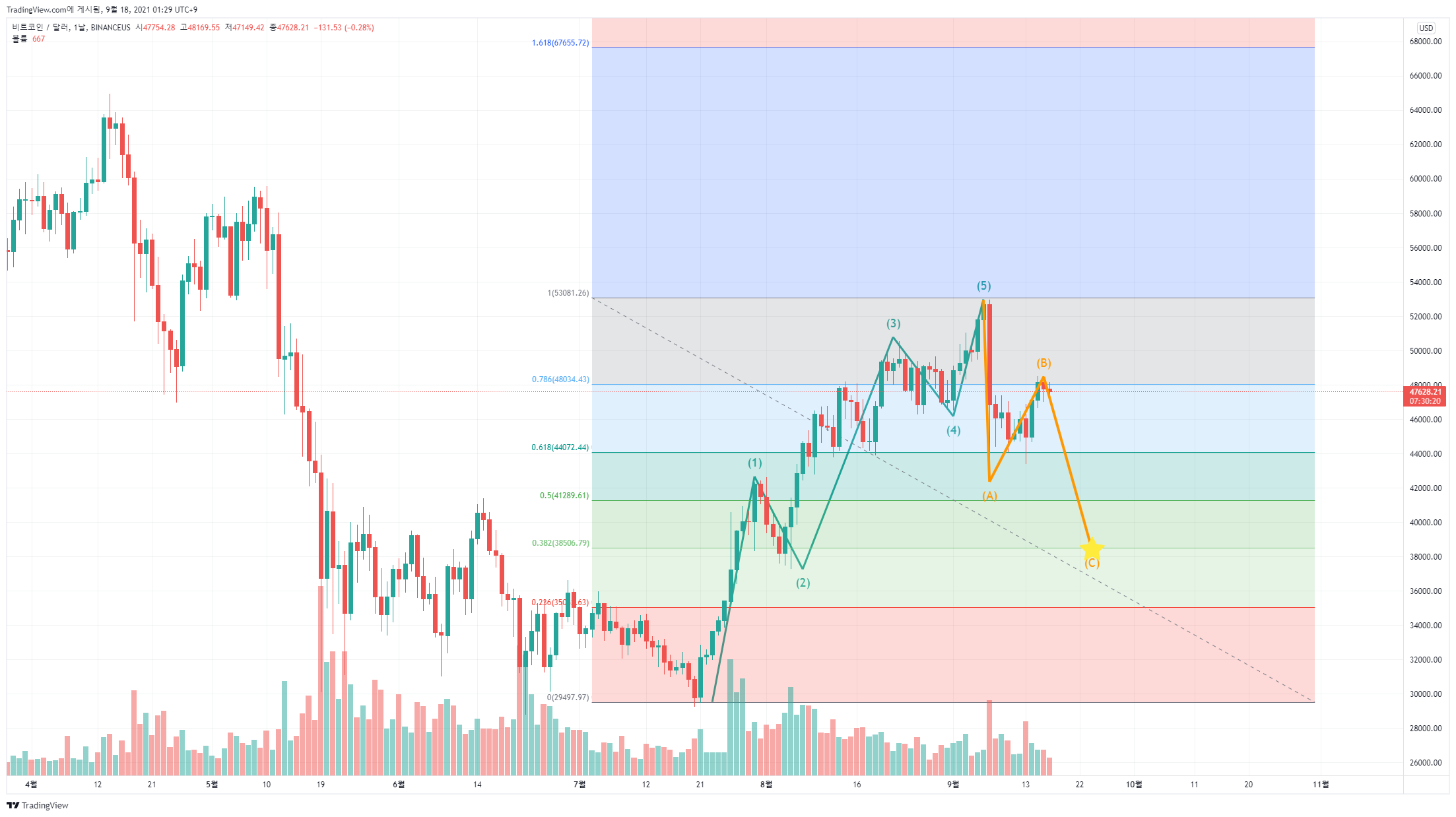 아직 하락 조정파가 끝나지 않았다면, 현재 ABC 파동 중 B까지만 진행되었고, A 파동의 크기를 보아 C 파동의 하락에서 큰 폭의 하락의 가능성이 높습니다. 예상대로 ABC 하락이 나온다면, 피보나치 0.382 구간과 추가 하락을 하지 못하고 반등하여 매물대가 많이 쌓인 구간으로 매수하기 좋은 가격은 38,500달러(약 4,500만원) 쯤에서 반등한다면 시드의 50% 이상 매수해보기 좋은 자리로 판단됩니다.