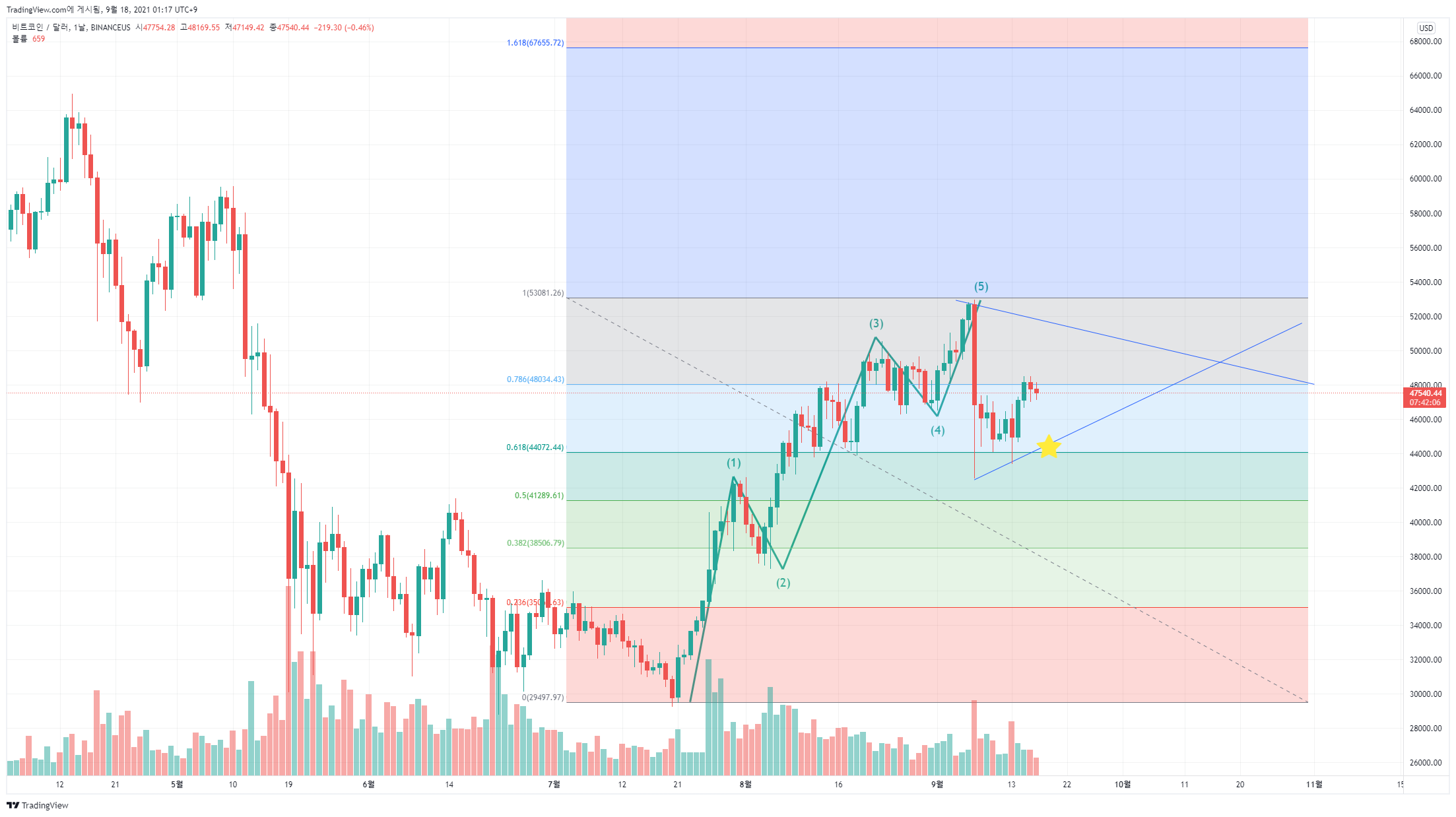 하지만 삼각수렴이 맞고 공격적인 투자 성향이라면 별표에 가격 44,000달러(약 5,100만원)에 시드의 30% 정도 매수하기 나쁘지 않은 가격으로 판단됩니다.