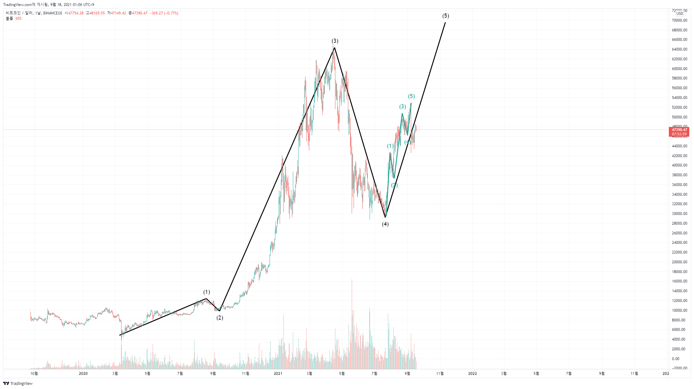 현재 3파 상승, 4파 하락이 끝났다고 생각하고 5파 상승장이라고 보는 것입니다.