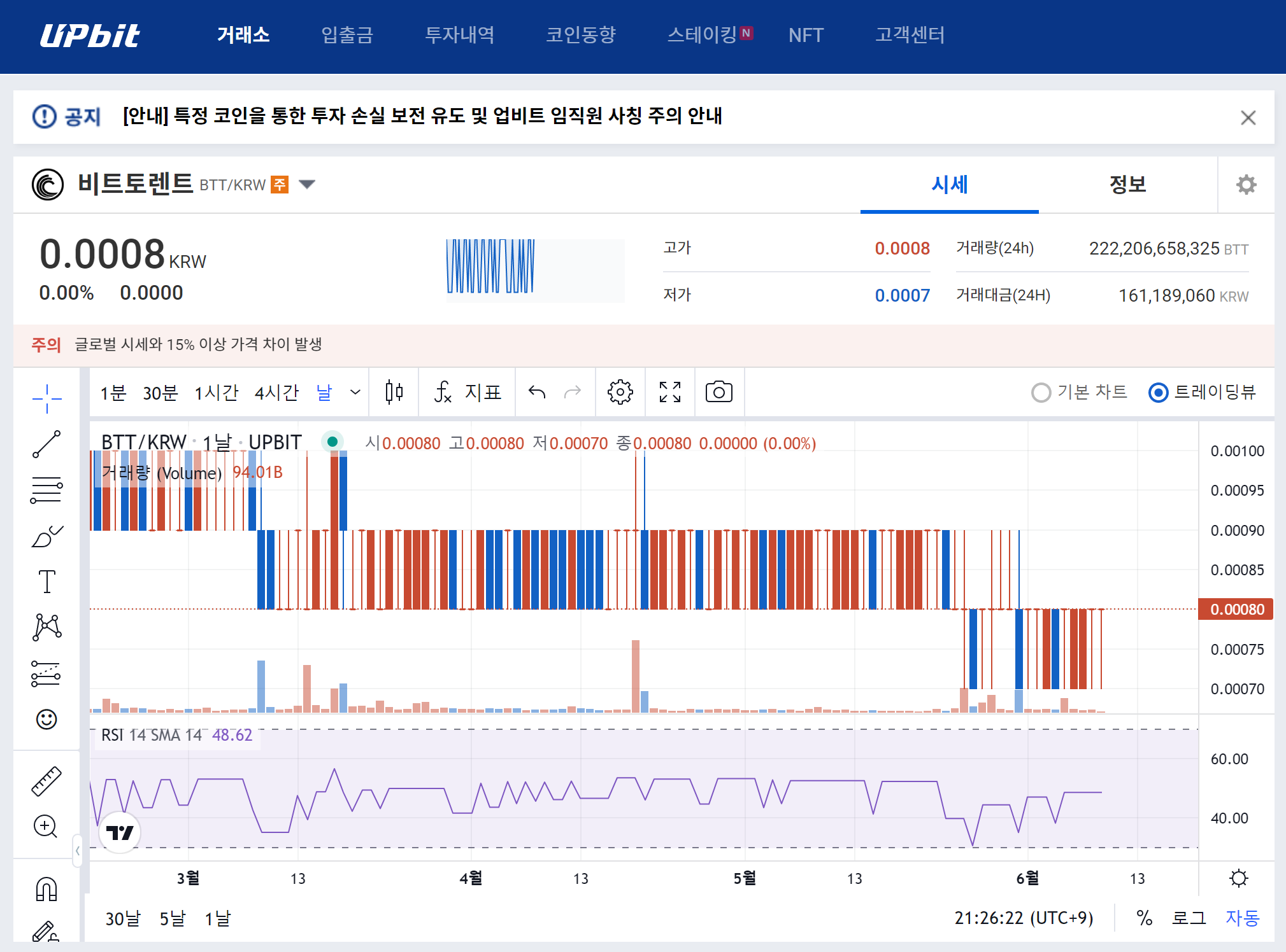 결론은, 비트토렌트 가격이 너무 낮아 호가에 따른 가격 변동이 심해 업비트 내부 규정에 따라서 주의 종목으로 지정된 것이라고 할 수 있습니다. 그럼 이걸 악재로 봐야 할까요? 개인마다 의견이 다르겠지만, 제 판단에는 악재도 호재도 아닌 것으로 보입니다.