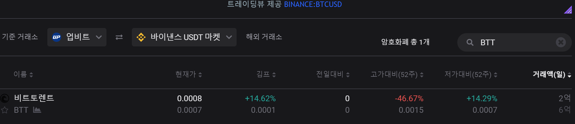 해외 거래소와 국내 거래소의 코인 가격 차이를 한눈에 보기 좋은 사이트입니다. 여기서 BTT로 검색하여 확인해보니 해외거래소와 15%에 가깝게 차이 나는 것을 볼 수 있습니다. 뉴스를 찾아봐도 딱히 악재나 호재 같은 게 없습니다. 그렇다면 왜 그런 걸까요?