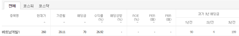 - 수익률 : 이 주식을 사면 얼마나 배당금으로 수익을 보는가 (배당금 / 주가 * 100)