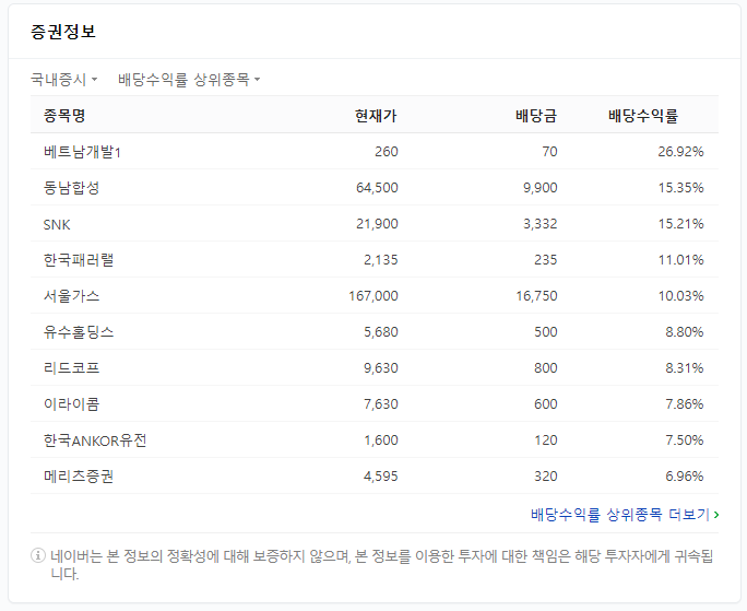 화면을 조금 내려보면, 배당주들의 목록을 확인할 수 있습니다. 더 많은 정보를 보기위해 배당수익률 상위종목 더보기를 클릭합니다.