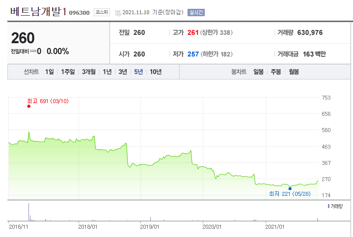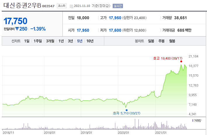 전형적인 나쁜 예시입니다. 과거 3년 배당금은 갈수록 낮아지고있으며, 주가 또한 꾸준히 하락하고 있습니다. 그런데 수익률이 높은 이유는 배당금이 늘어나는 것보다 주가가 떨어지는 것이 더 빠르기 때문에 수익률이 높은 것이라고 해석할 수 있습니다.