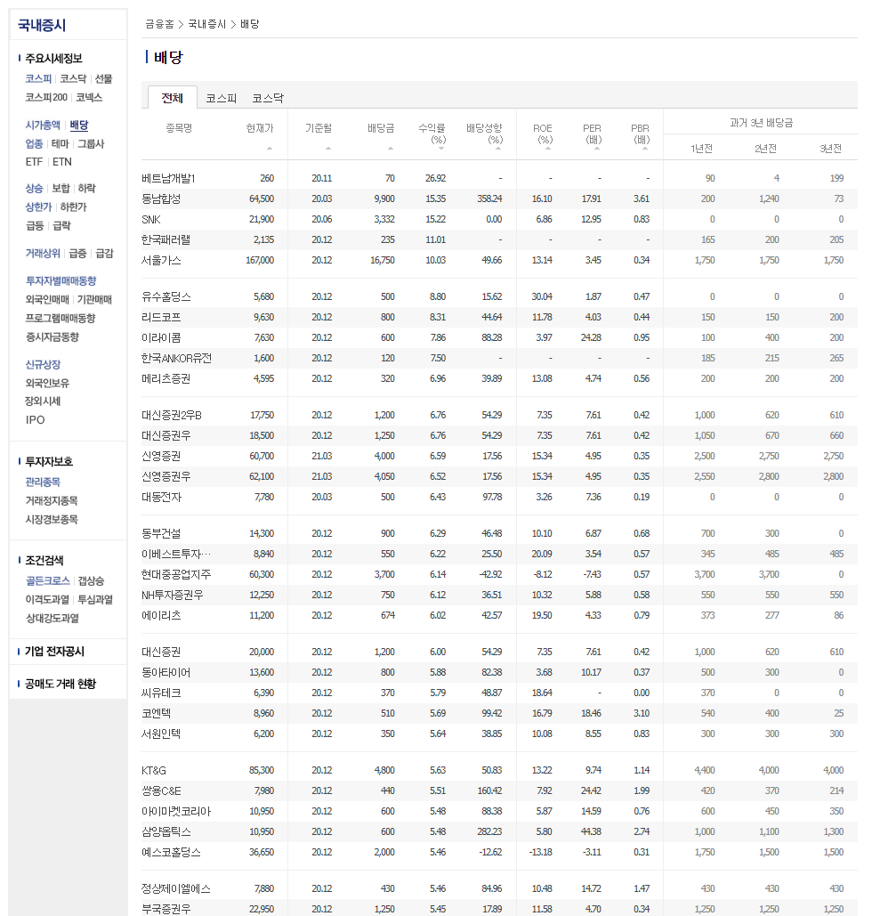 배당수익률 상위종목 더보기를 클릭하면 더 많은 배당주의 정보가 나옵니다. 많은 정보들 중에서도 어떤 정보를 봐야 배당주에 투자하여 안정적인 수익을 볼 수 있을지, 주목해서 봐야 할 항목들에 대해 설명하겠습니다.