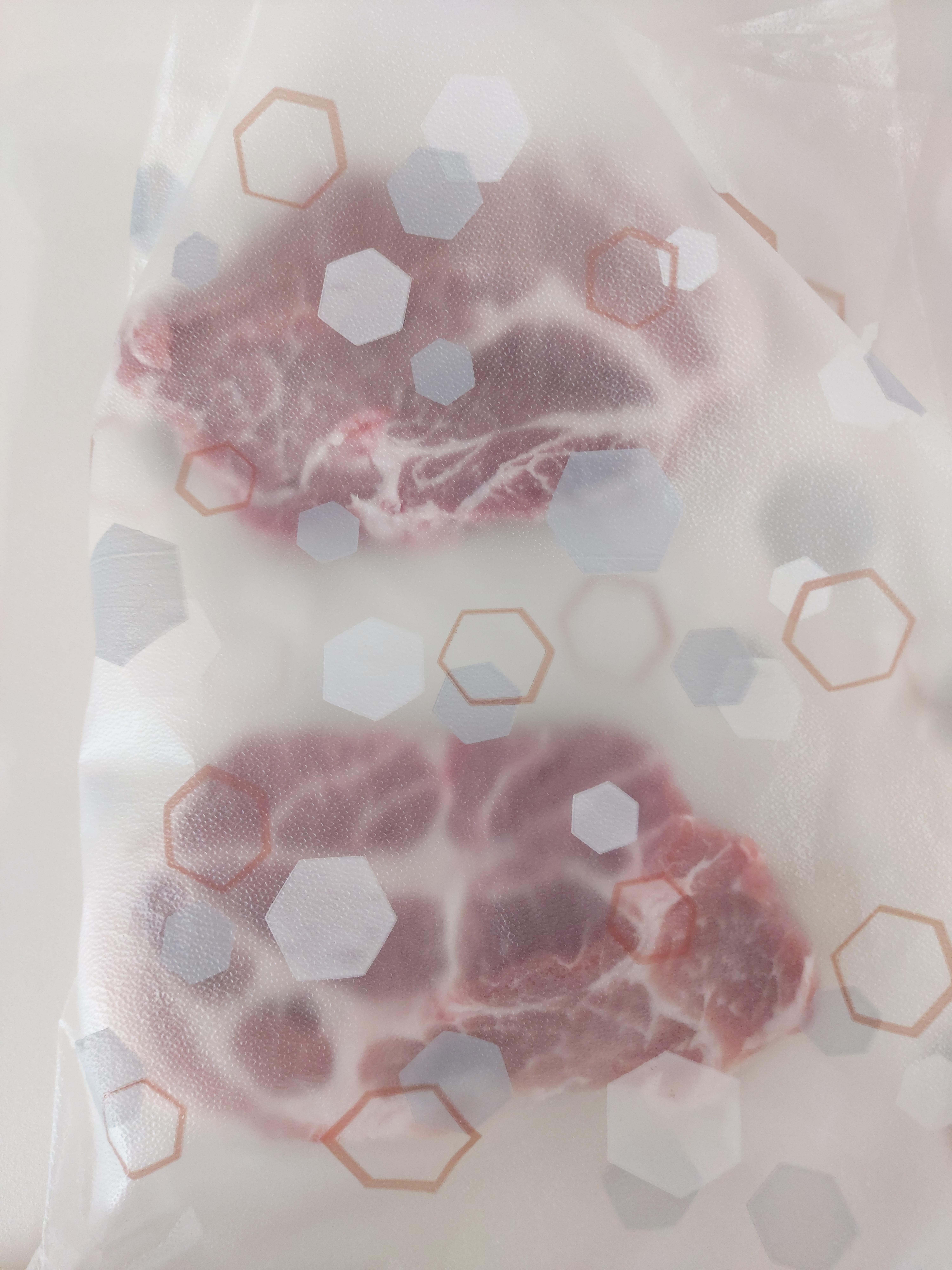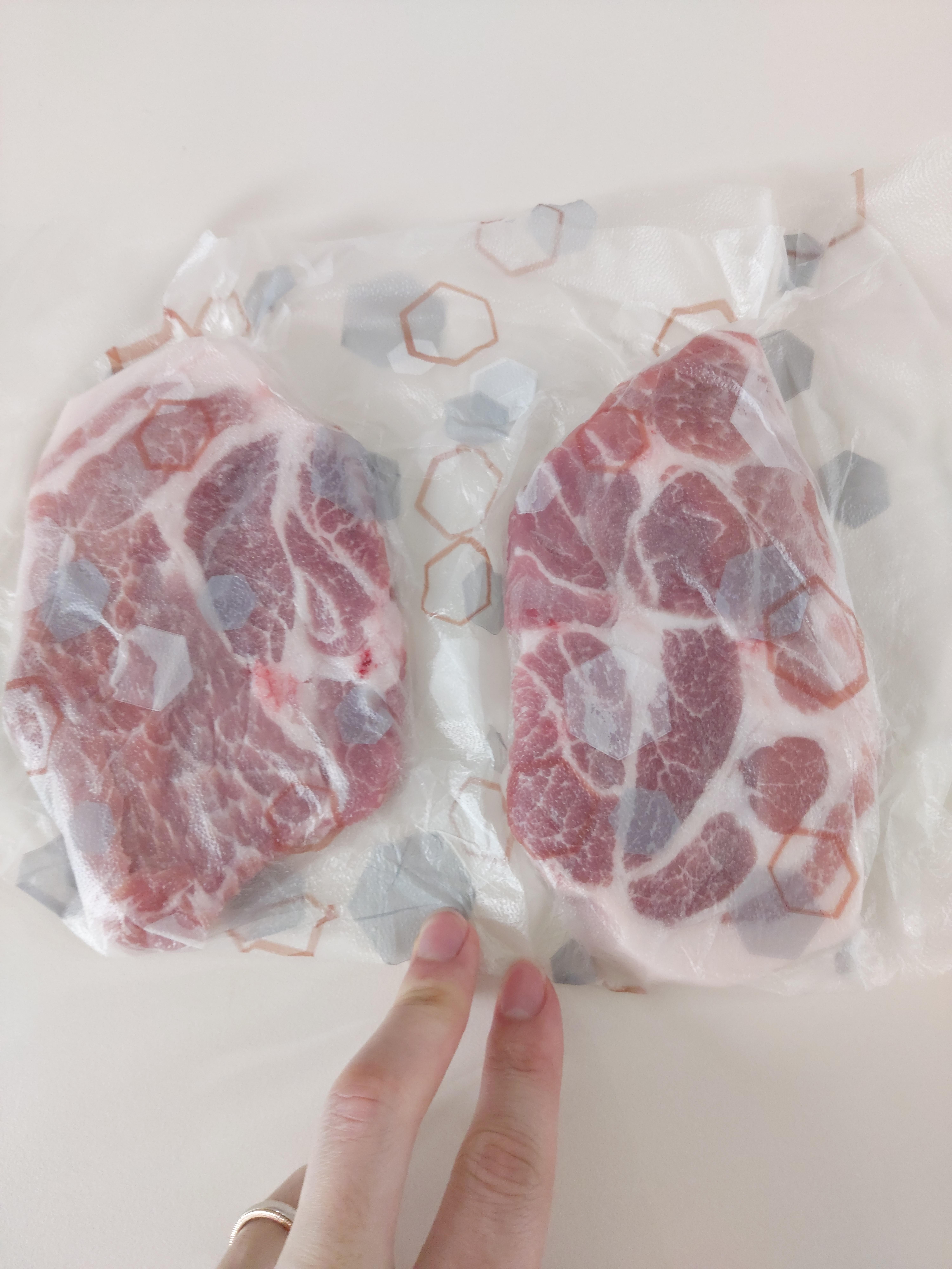 이제 매직 랩을 꾹꾹 눌러서 아래 그림처럼 만들어줍니다. 매직 랩 안쪽이 끈끈하기 때문에 꾹꾹 눌러주면 진공포장한 것처럼 고기에 공기가 들어가는 부분이 거의 없고 고기 말고 매직 랩끼리 붙은 부분은 완전히 접착되기 때문에 공기가 고기로 들어가지 않습니다.