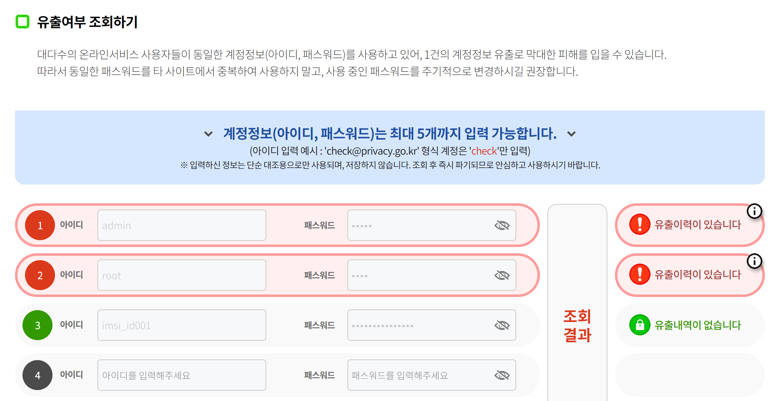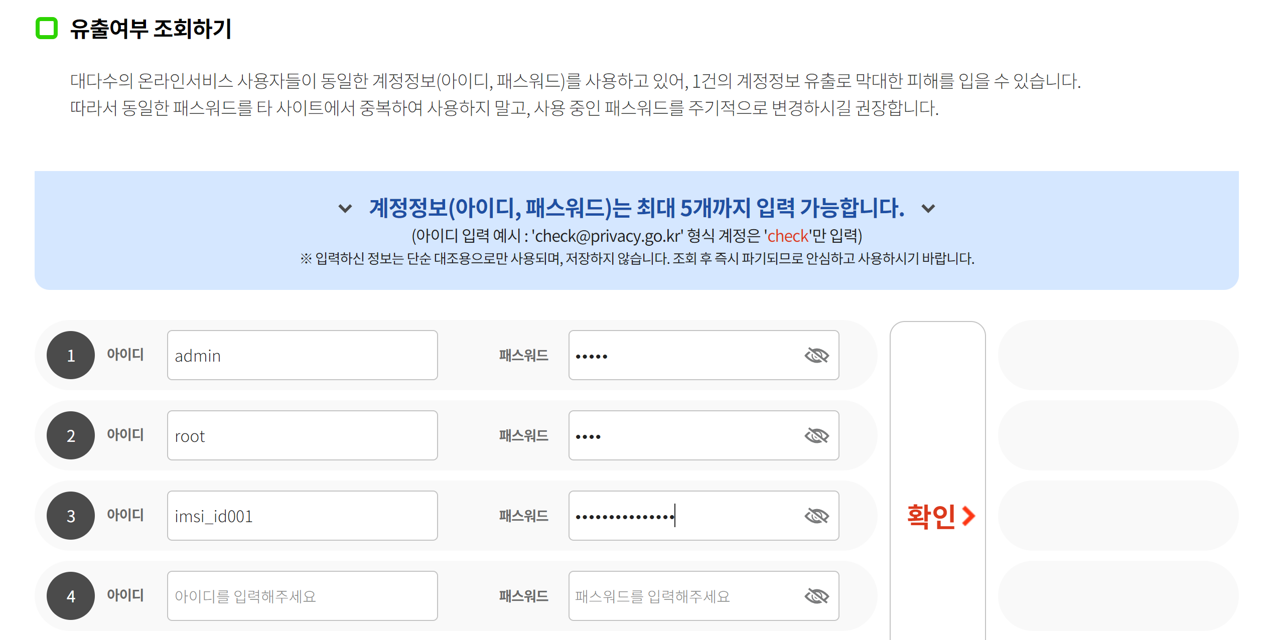 이제 여기서 내가 자주 쓰는 아이디와 비밀번호(패스워드)를 입력하여 빨간색 확인 버튼을 누르면 해킹당했는지(정보 유출 여부) 결과를 표시해 줍니다.