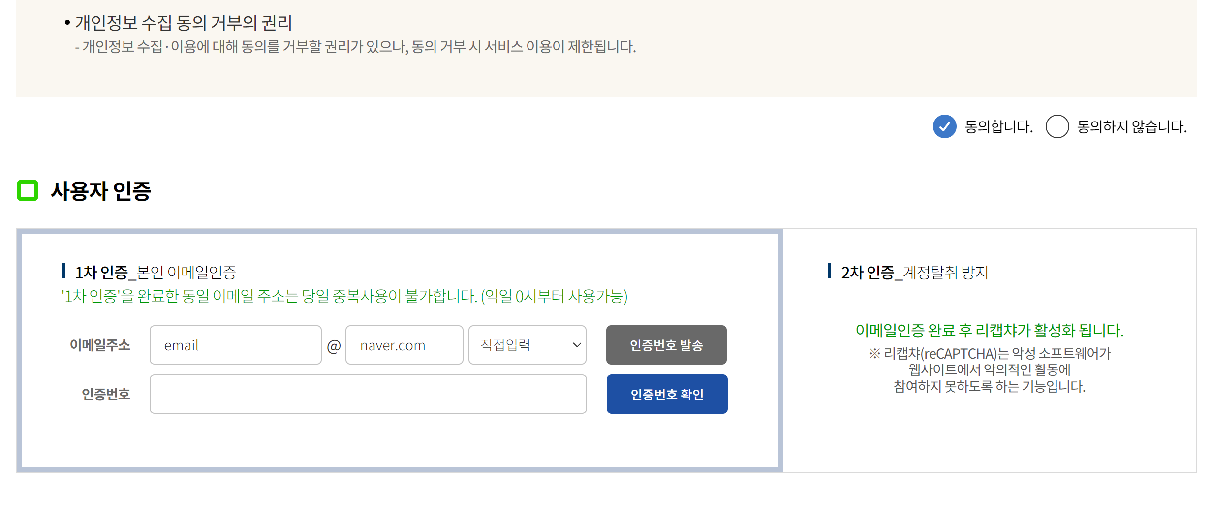 스크롤을 내려서 보면, 사용자 인증하는 부분이 있고 간단하게 메일을 통해 인증번호를 받아 인증을 받으신 후에 2차 인증까지 진행하시면 다음 화면으로 이동할 수 있습니다.