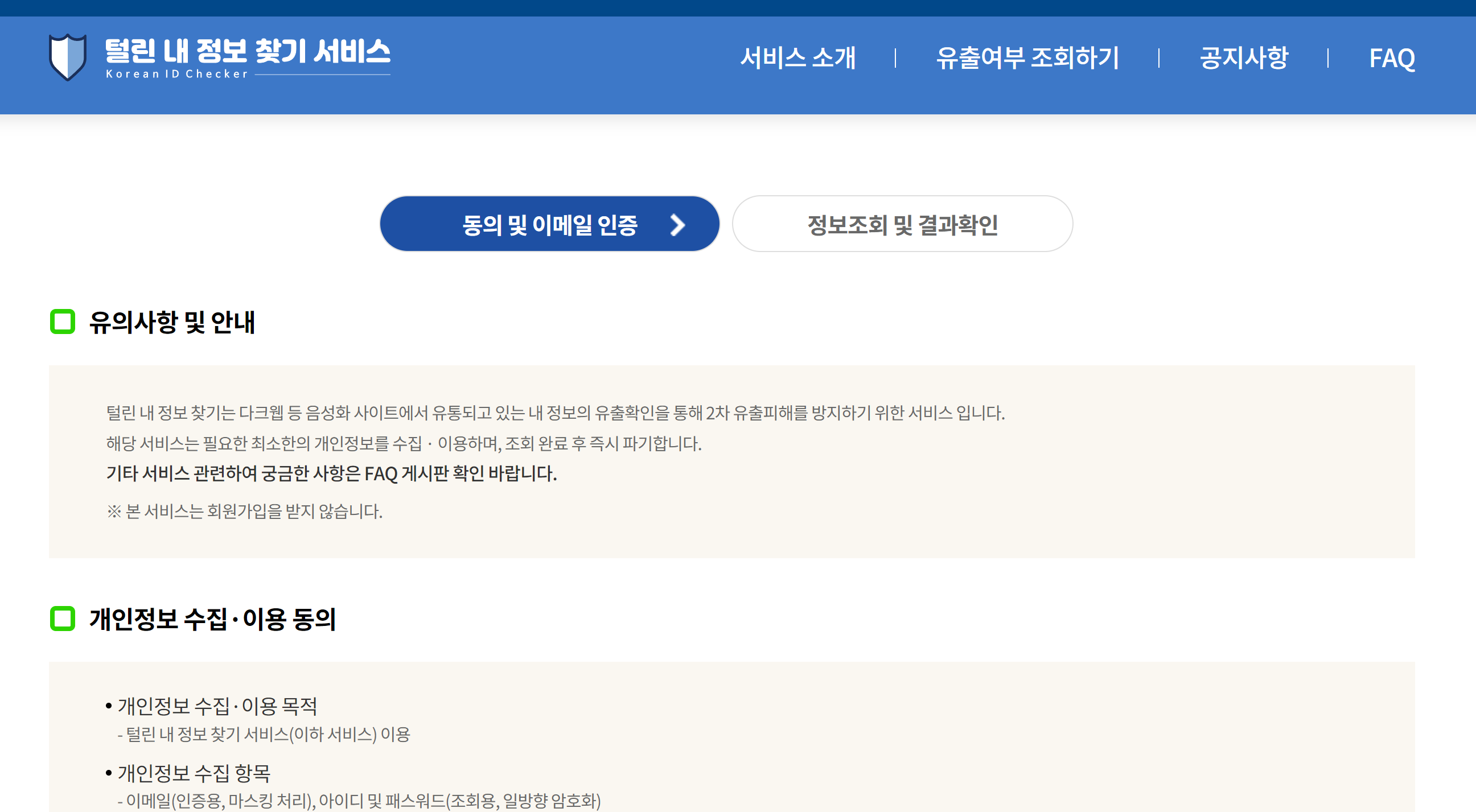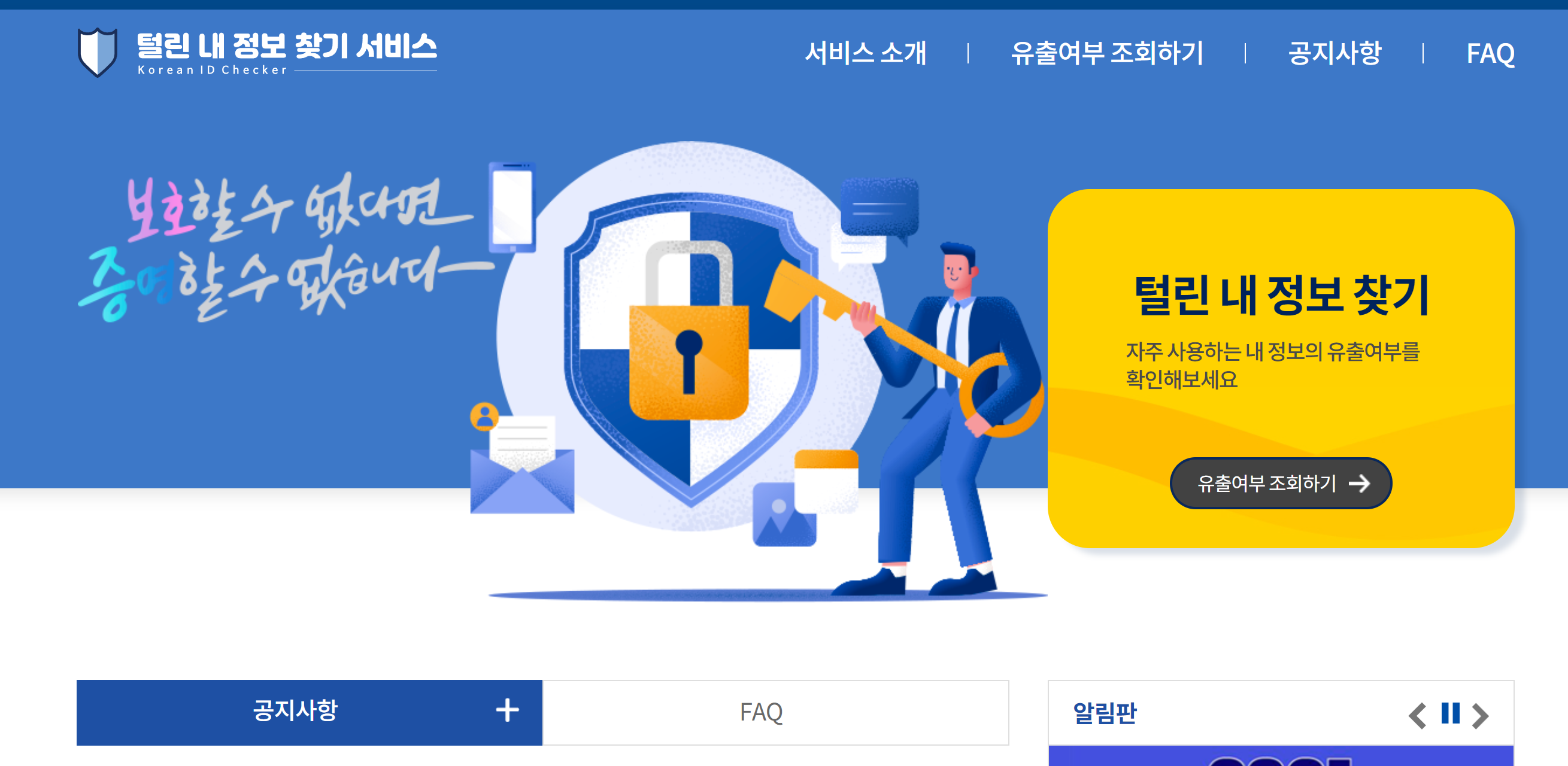 "털린 내 정보 찾기"라는 서비스명으로, KISA(한국인터넷진흥원 인터넷침해대응센터)에서 만든 서비스로 국가기관에서 직접 국민들의 사이버 보안 안전을 위해 만든 서비스입니다.