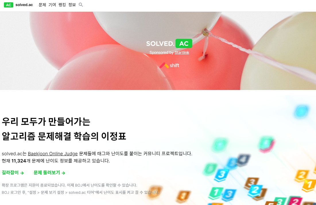우리 모두가 만들어가는알고리즘 문제해결 학습의 이정표 solved.ac는 Baekjoon Online Judge 문제들에 태그와 난이도를 붙이는 커뮤니티 프로젝트입니다. 현재 11,324개 문제에 난이도 정보를 제공하고