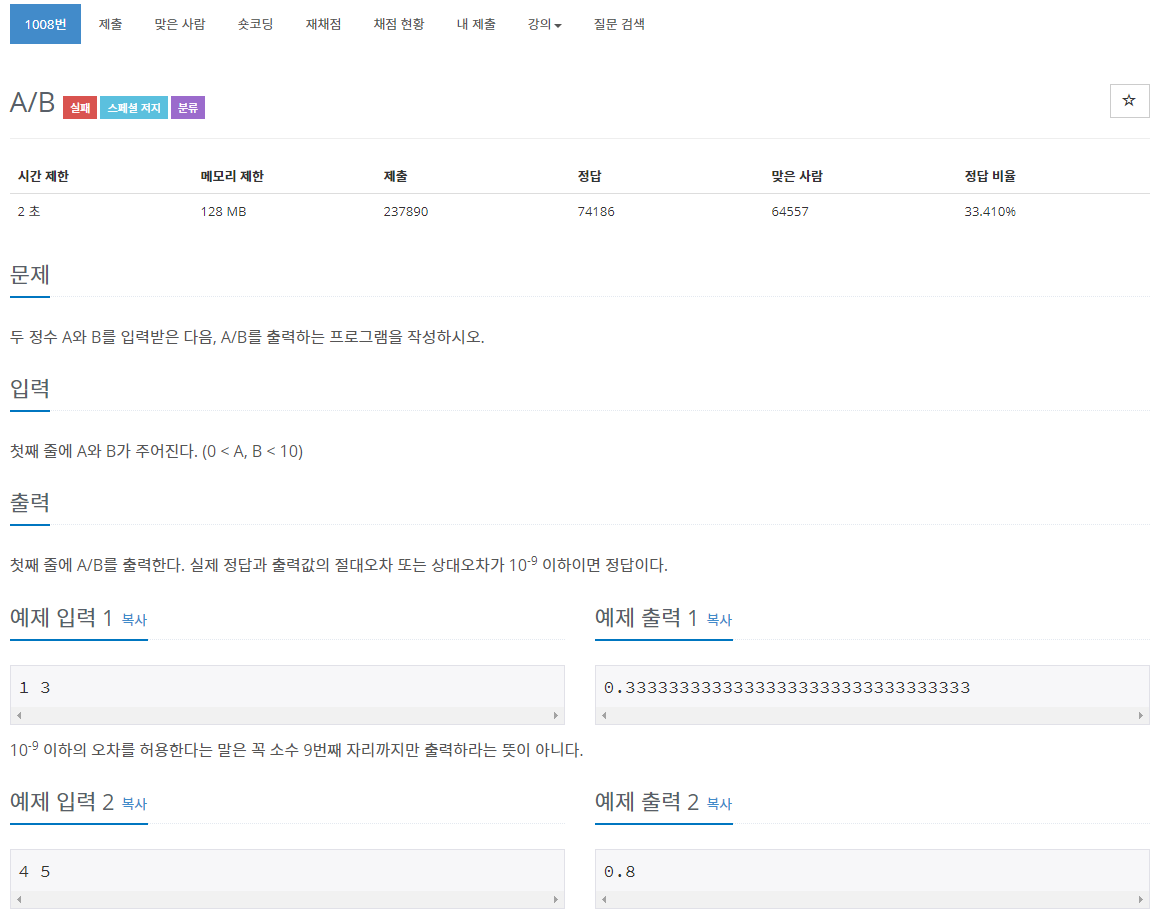 틀린 문제 1008을 클릭하면 백준 사이트로 화면이 바뀐다.