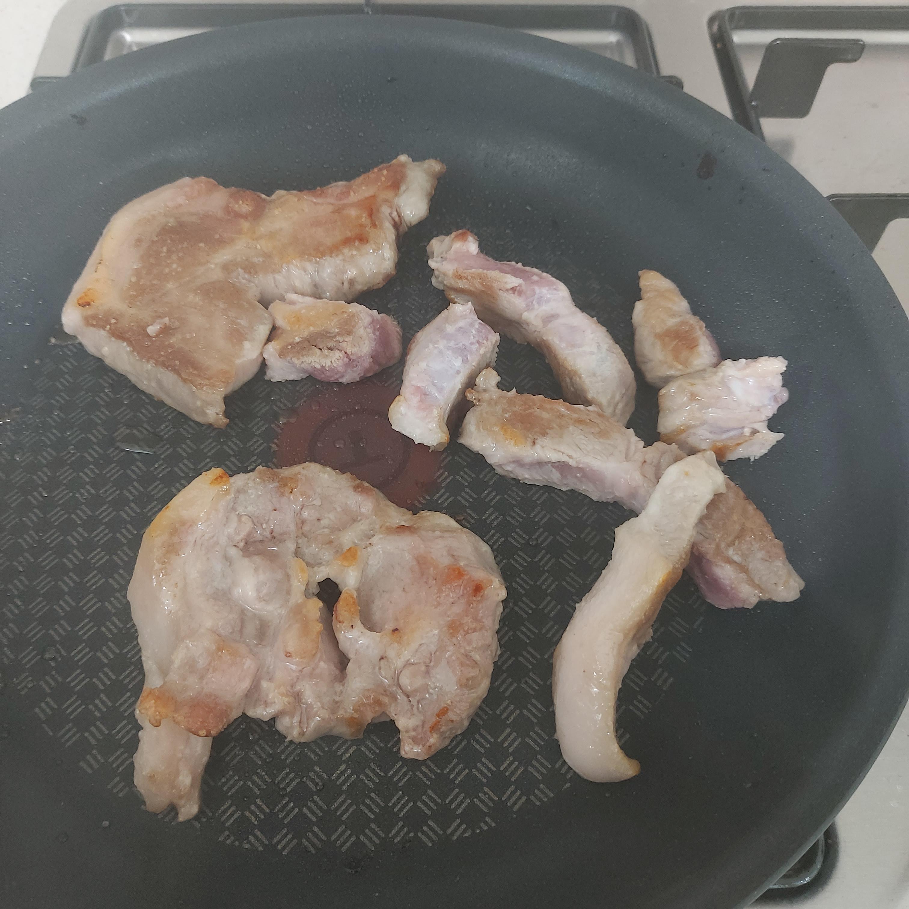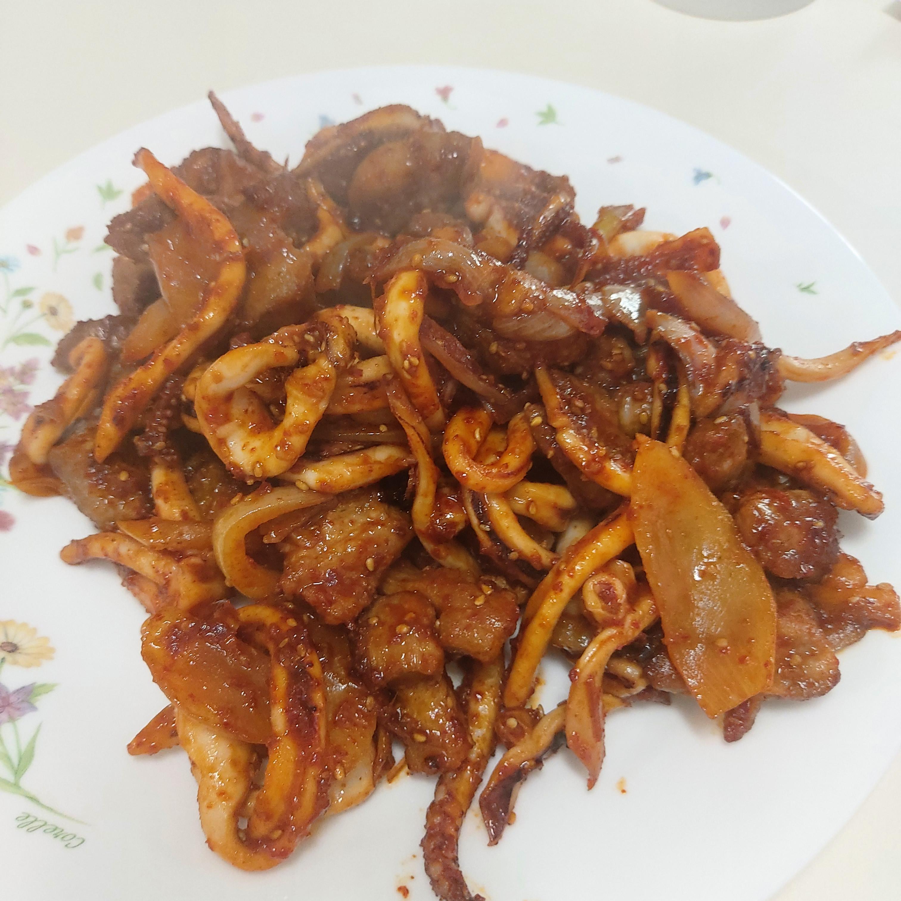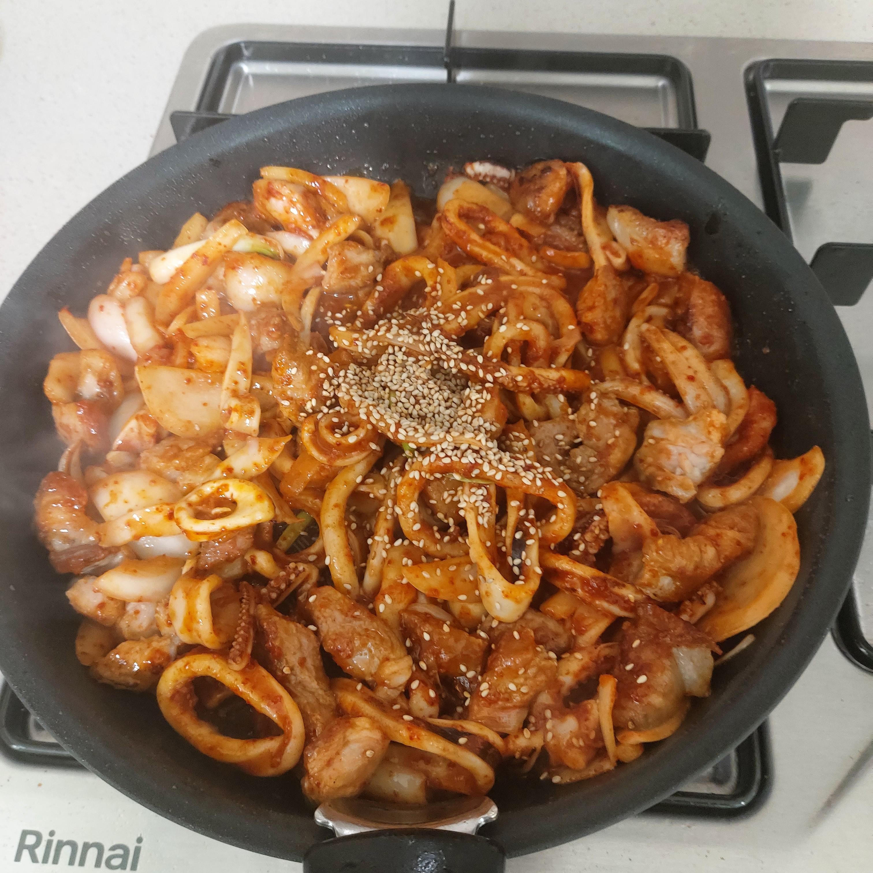 이제 고기를 굽습니다. 고기를 오징어와 같이 버무리지 않고 굽는 이유는 같이 버무려서 볶아보면 고기가 익었나...? 하는 의문이 들지않게 하기위함입니다. 먼저 구워도 맛있습니다. 삼겹살은 기름이 많아 볶을때 더 잘 볶아지는데 목살로 해도 맛있습니다. 개인적으로는 차돌박이도 맛있을거 같습니다.