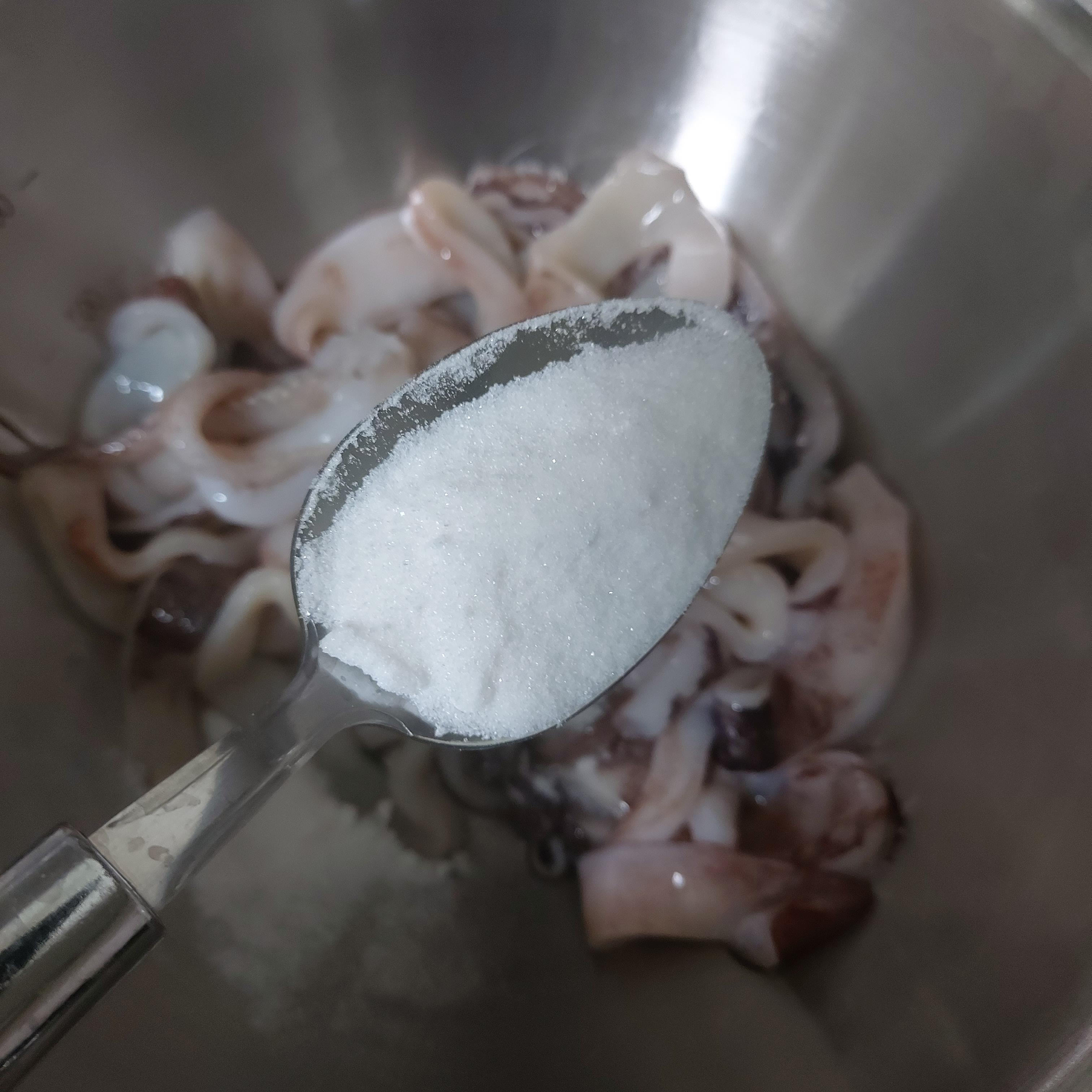 먹기좋게 잘라진 오징어에 숟가락으로 설탕을 2번 넣고 버무려줍니다. 설탕을 먼저 넣어야 밑간이 잘됩니다.