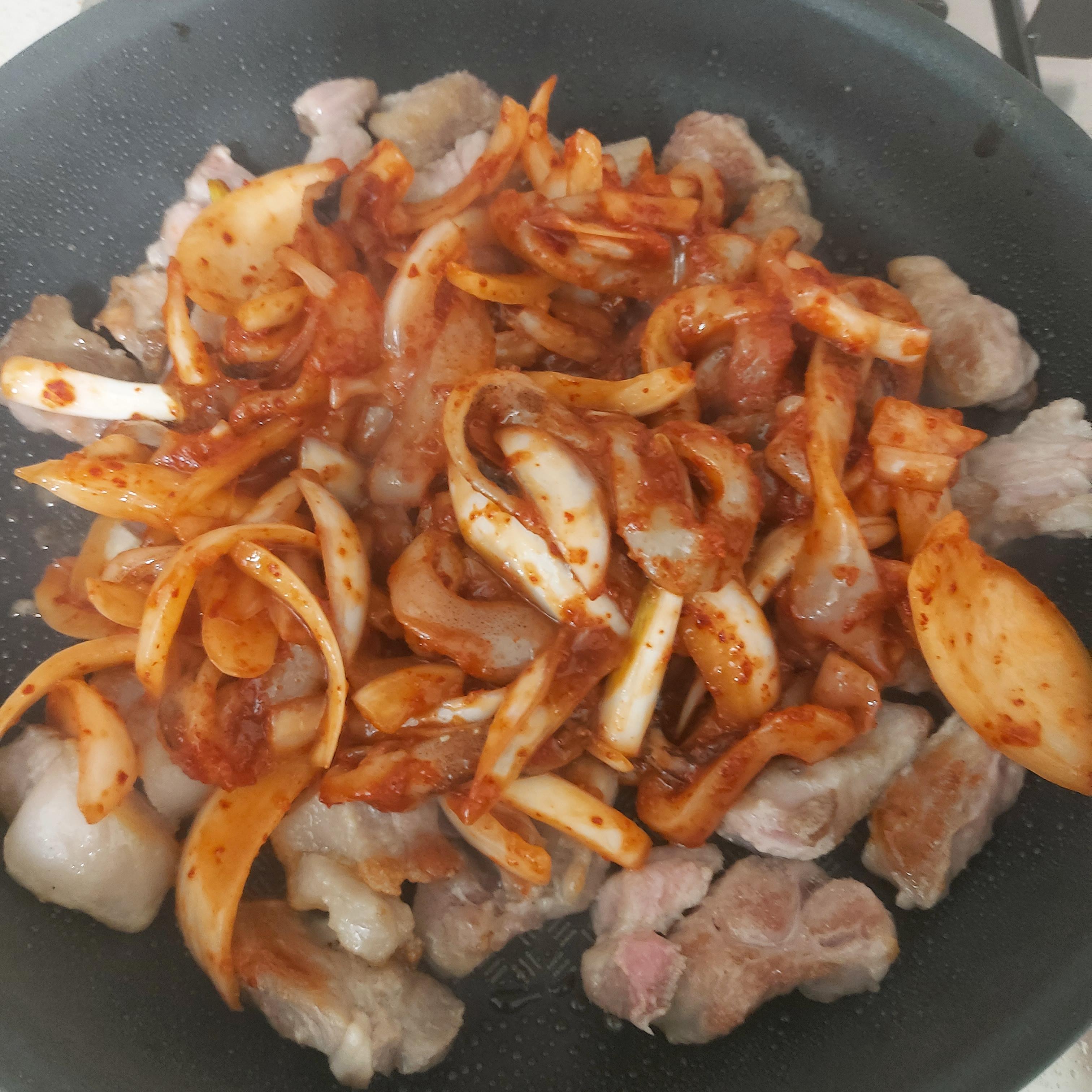 고기가 어느정도 익었으면, 이제 버무려둔 오징어를 넣고 볶습니다.