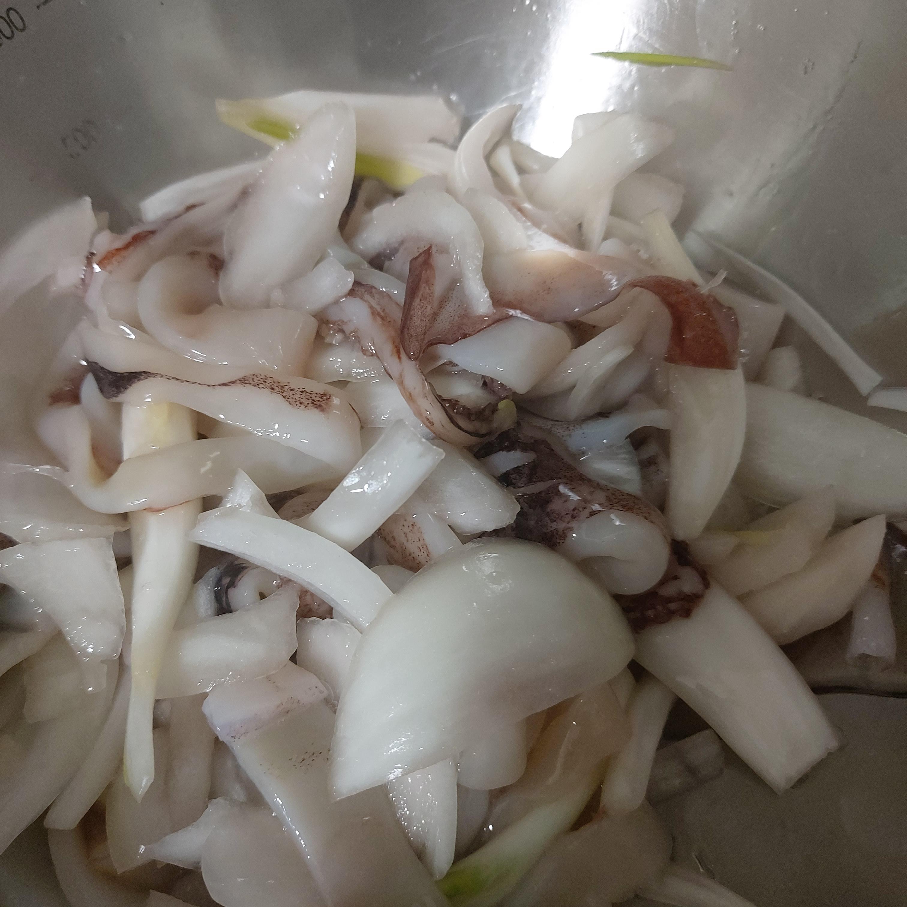 양파 1개 넣고 버무려줍니다. 버무릴때 양파를 짓누르면서 양파즙이 나오게 버무려주세요. 양파의 단맛과 향이 오징어의 잡내를 잡아줍니다. 맛술을 한숟갈 넣어서 오징어의 바다향을 한번 더 잡아줍니다.