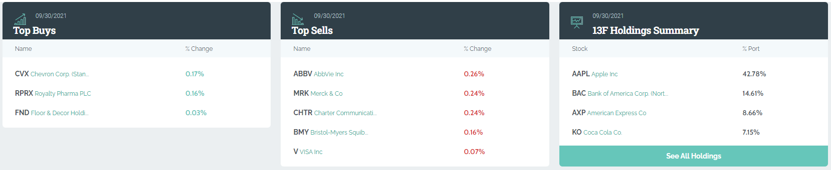 홈페이지가 영어로 되어있어서 이용이 불편하지만, 최근에 어떤 주식을 매수(Top Buys) 했고 팔았는지(Top Sells) 그리고 어떤 종목들을 어떤 비율로 갖고 있는지 볼 수 있습니다. 확인 결과, 애플에 42% 정도의 높은 비중으로 갖고 있고 최근에는 CVX라는 종목을 메수 한 것으로 보입니다. 워렌 버핏이 기존에 매수한 종목들은 이미 가격이 많이 상승했을 것 같고 최근에 매수했다면 워렌버핏과 비슷한 가격에 매수가 가능할지도 모르니 찾아보면 좋겠습니다.