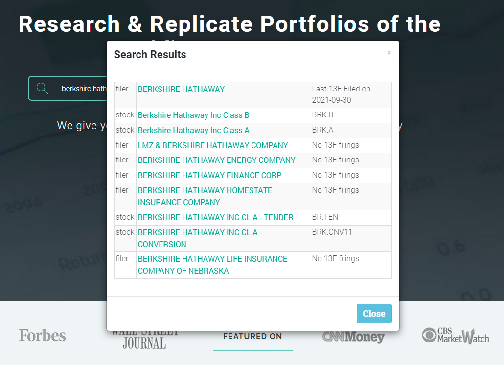 헤지펀드를 트래킹하는 서비스입니다. 여기서 워렌버핏의 투자 정보도 확인할 수 있습니다. 검색을 위해서는 영어로 검색하셔야 합니다. "berkshire hathaway" 아래처럼 검색 해보세요.