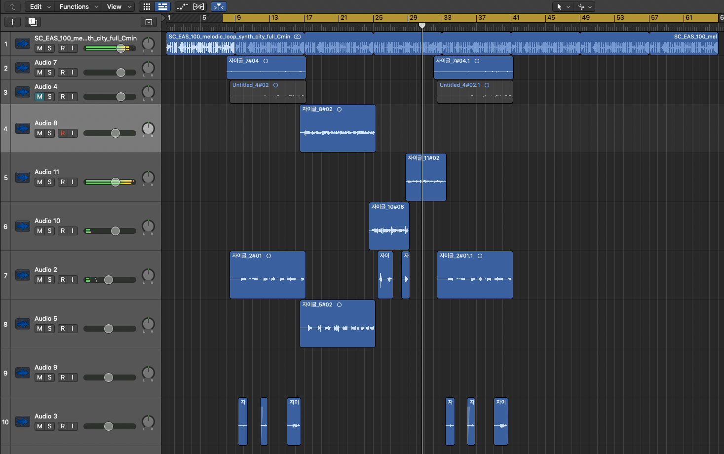 그렇게 분할 녹음을 하게 되면, 아래와 같이 트랙이 많아지고 녹음마다 텐션이 달라 이질감을 느끼게 됩니다.