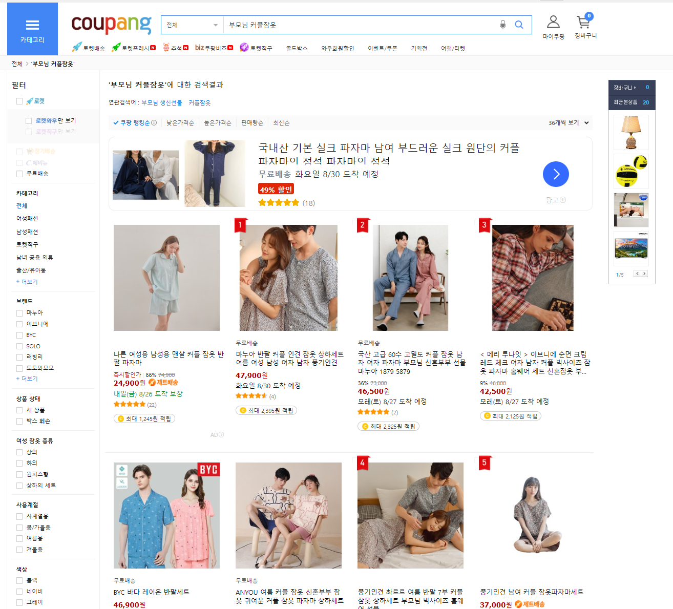인터넷에 부모님 커플룩, 부모님 커플잠옷으로 검색해보면 많은 상품들이 나오는데 부모님께서 평소에 잠옷을 입지 않으시더라도 한번 입어보시라고 권해보시면 의외로 만족감을 느끼실 수 있습니다. 부모님들께서 골프를 즐기신다면 커플 골프웨어 선물 해드리면 골프를 같이 치러 가시는 분들에게 자식 자랑하는 재미와 함께 만족감을 높일 수 있습니다.