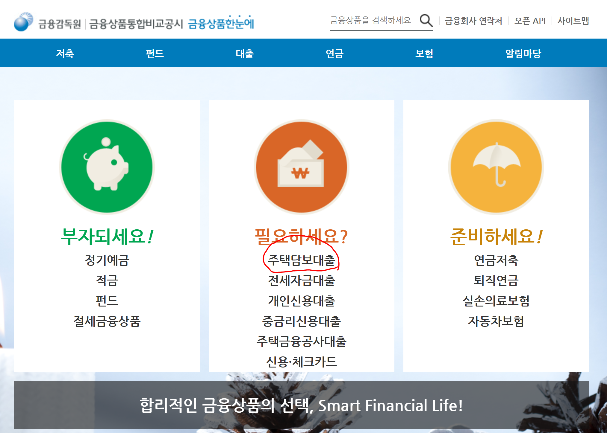 사이트에 접속하여, 주택담보대출을 클릭하면