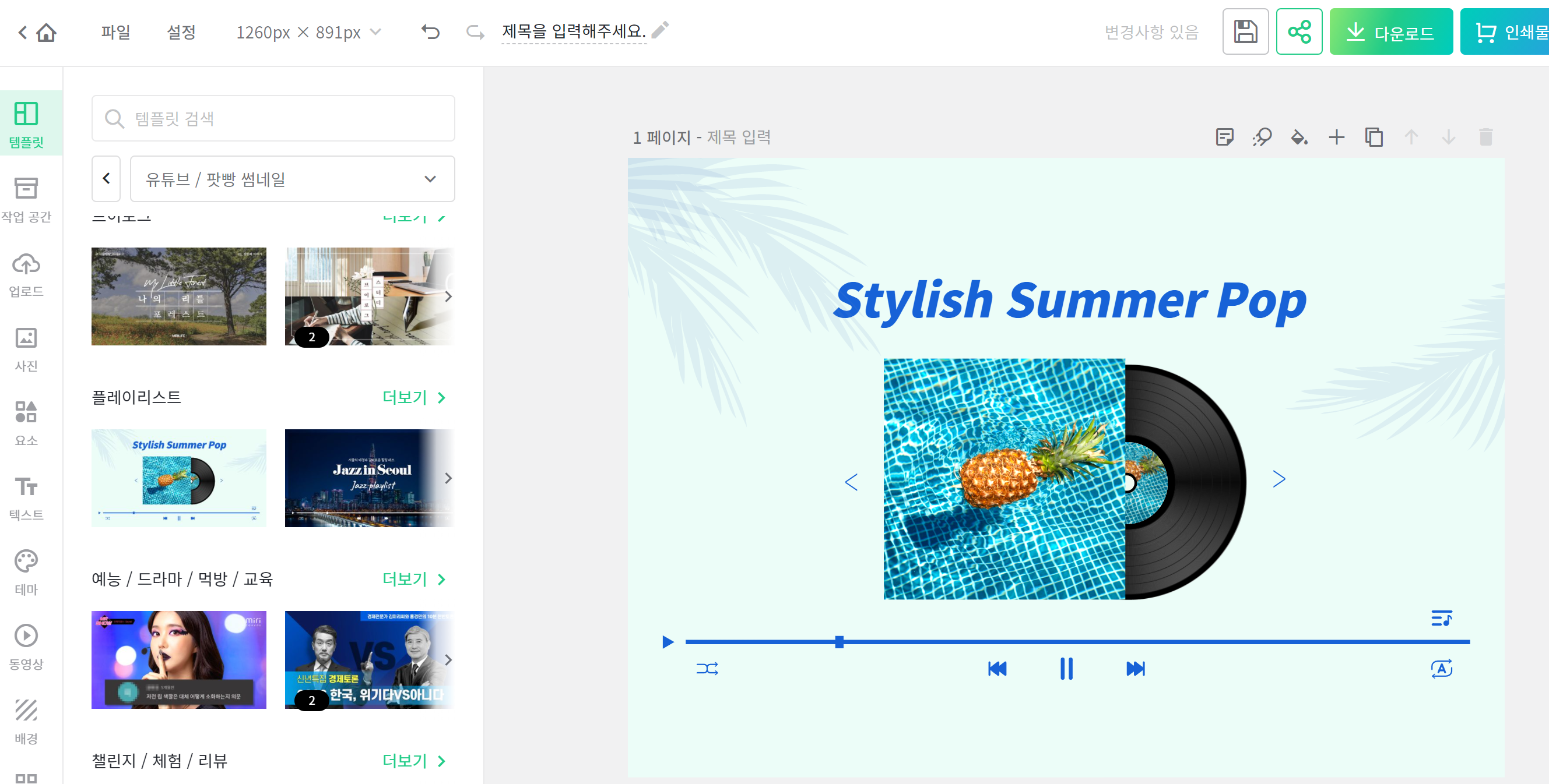 저는 유튜브에 썸네일을 클릭하였고, 음악을 좋아해서 플레이리스트 느낌 나는 썸네일 템플릿을 골랐습니다. 이제 여기서 안에 그림들을 하나씩 클릭해서 원하는 문구나 사진의 위치를 변경하여 입맛대로 변경할 수 있습니다. 작업을 마친 후 우측 상단에 다운로드 버튼을 클릭하시면, 바로 사진 파일로도 다운로드되어 매우 편합니다.
