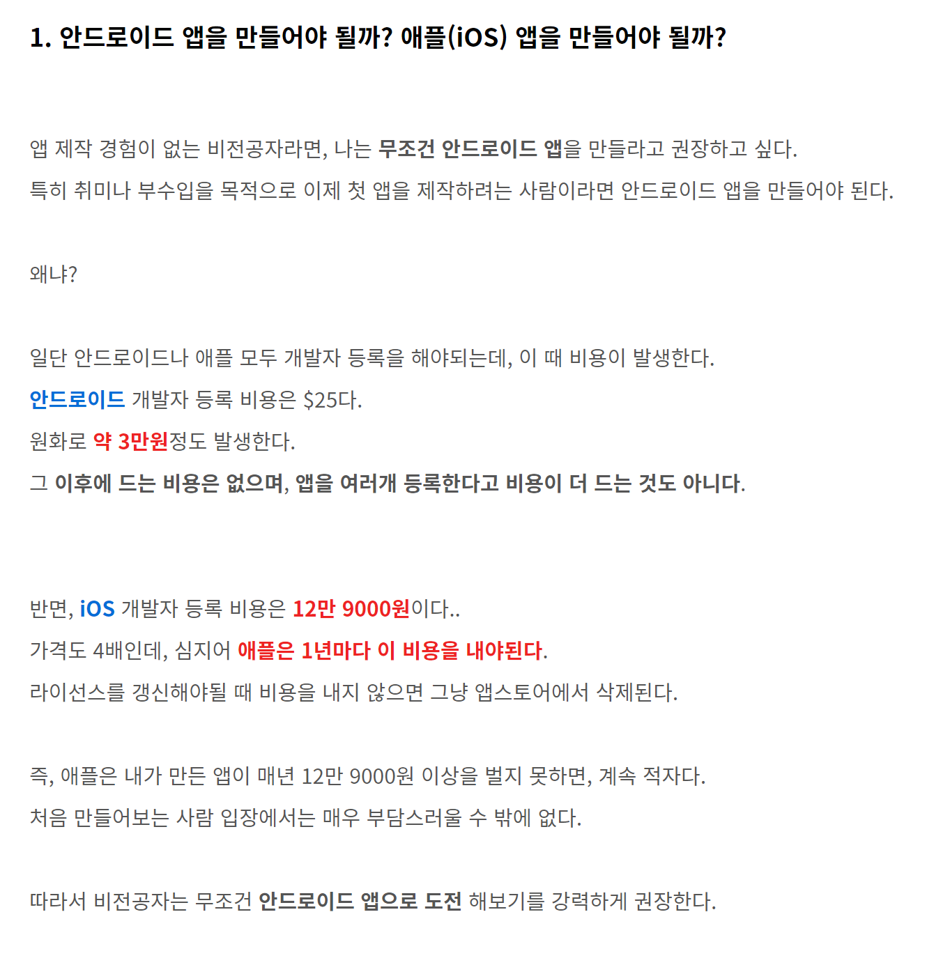 쭉 스크롤 내려보다 보니, "비전공자의 안드로이드 어플 만들기 프로젝트 (앱 개발 후기)" 이런 글이 눈에 들어와서 해당 글을 읽어보면서 감을 잡아보겠습니다.