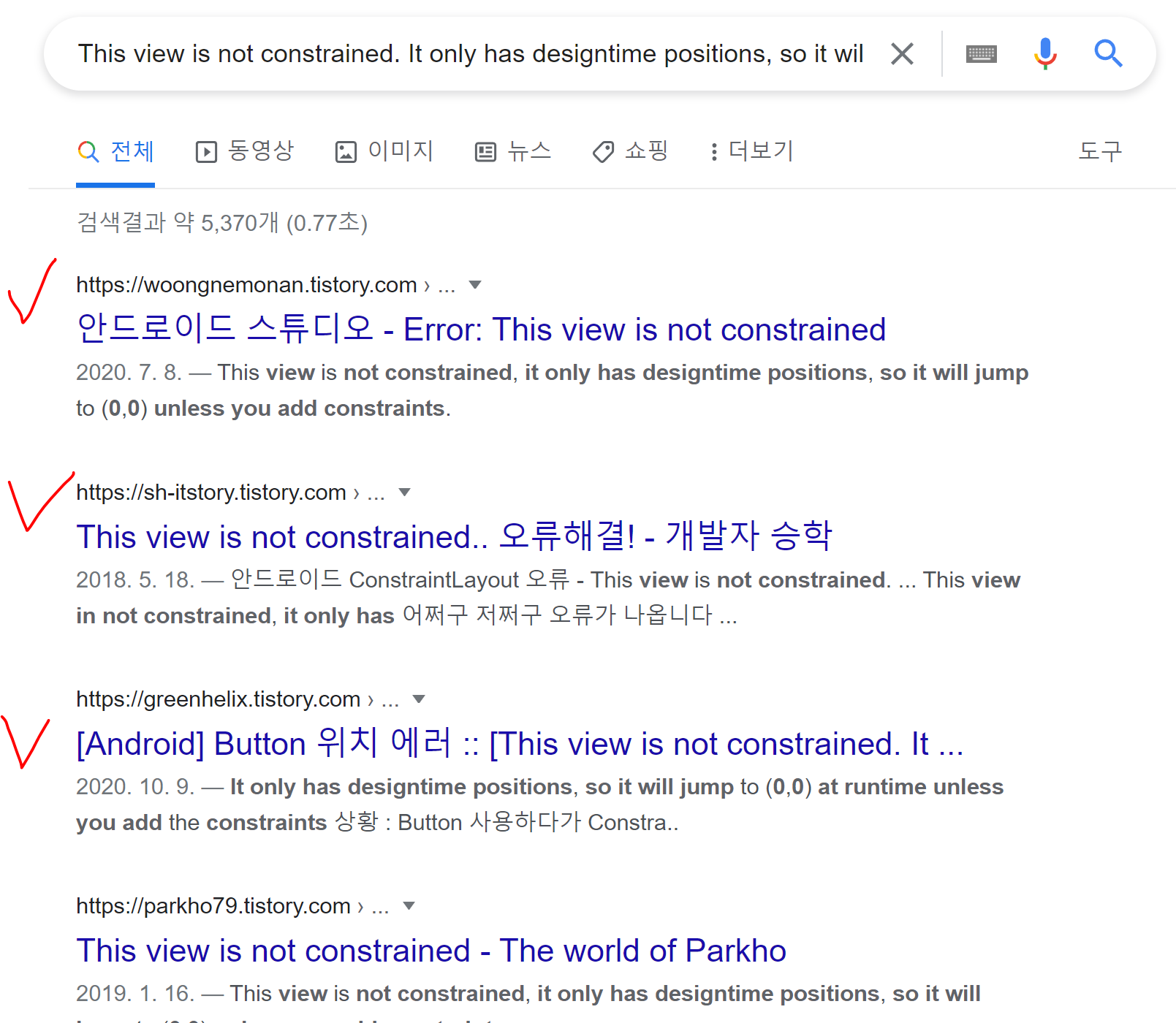 똑같은 느낌표 내용이 4개가 있으니 하나만 보면 되겠습니다. 이제 구선생님을 찾아뵙습니다. 바로 에러 메시지를 복사 붙여 넣기 하겠습니다. 역시 구선생님. 선생님답게 바로 정답을 알려주지 않고 정답 힌트 부스러기를 던져주셨습니다. 저는 검색 결과 중에 위에 3개가 제목이 맘에 들어서 한번 훑어보도록 하겠습니다.