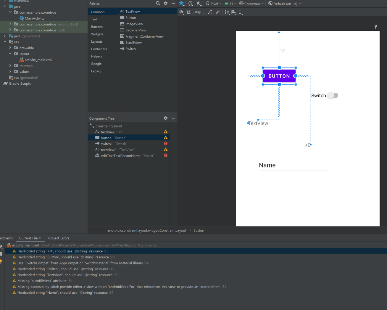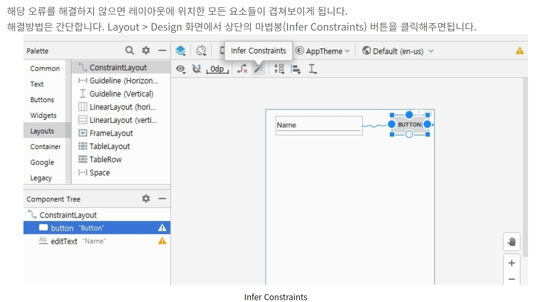 그림과 같이 저도 따라서 해보니 에러가 사라지면서 레이아웃에 버튼이 연결된 모습을 볼 수 있었습니다.