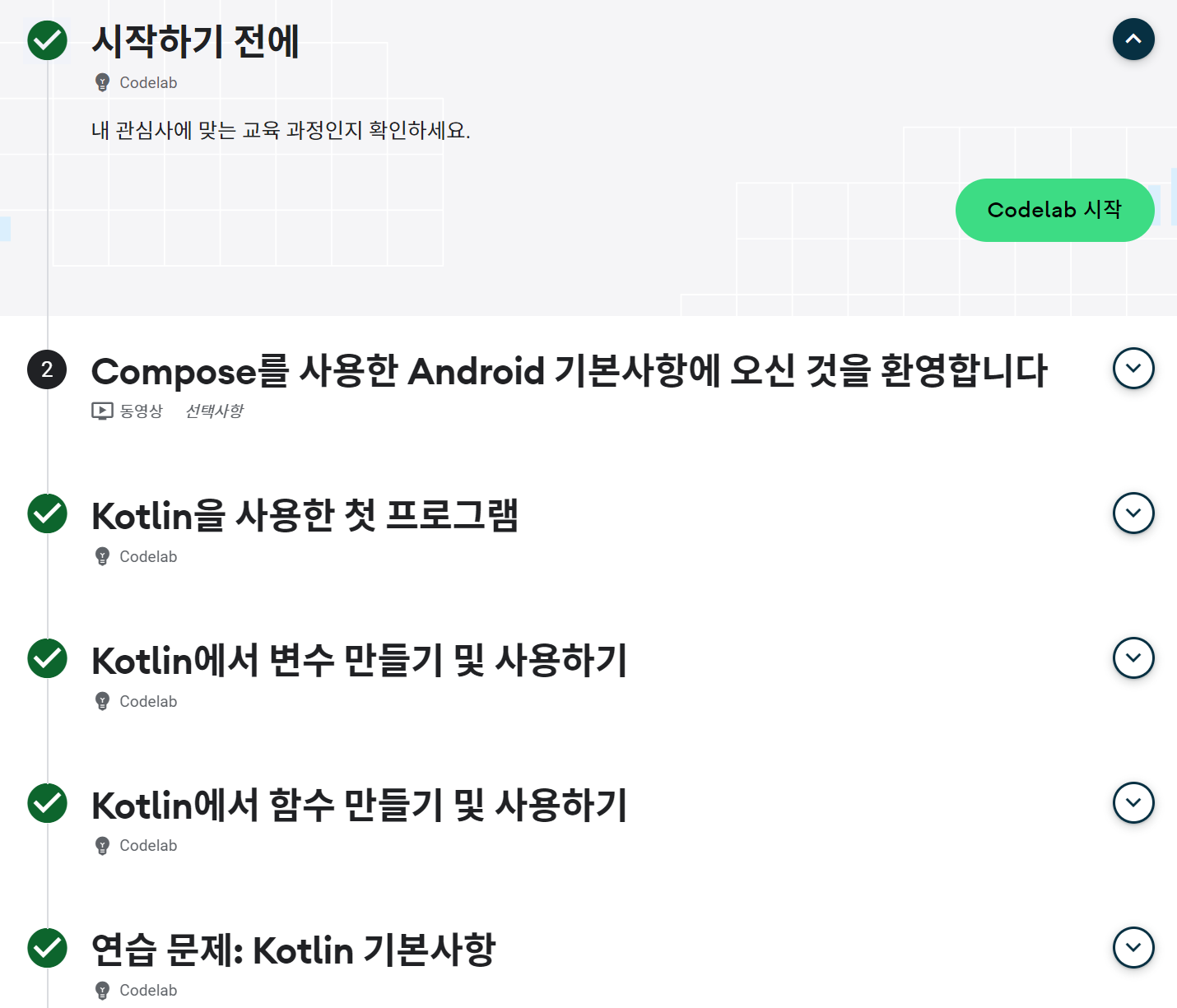 Jetpack Compose를 사용하여 Android 앱을 빌드하는 방법을 배울 수 있다고 한다.Jetpack Compose가 뭔지 모르겠지만, 이제 알려주리라 믿고 과정 시작 버튼을 눌러본다.