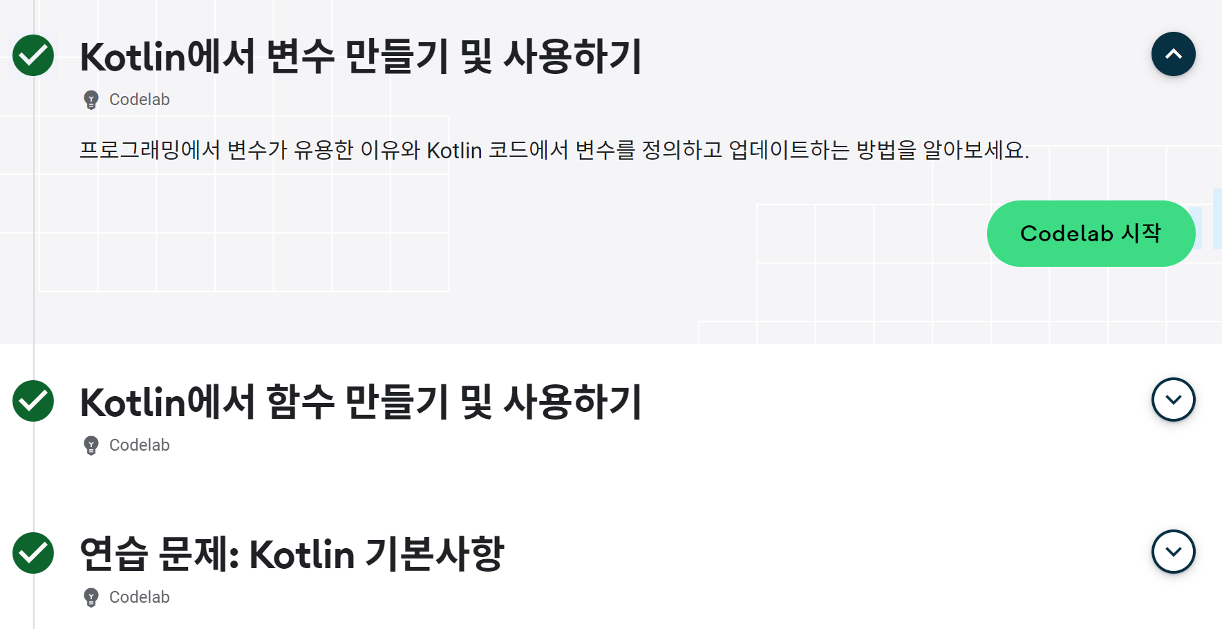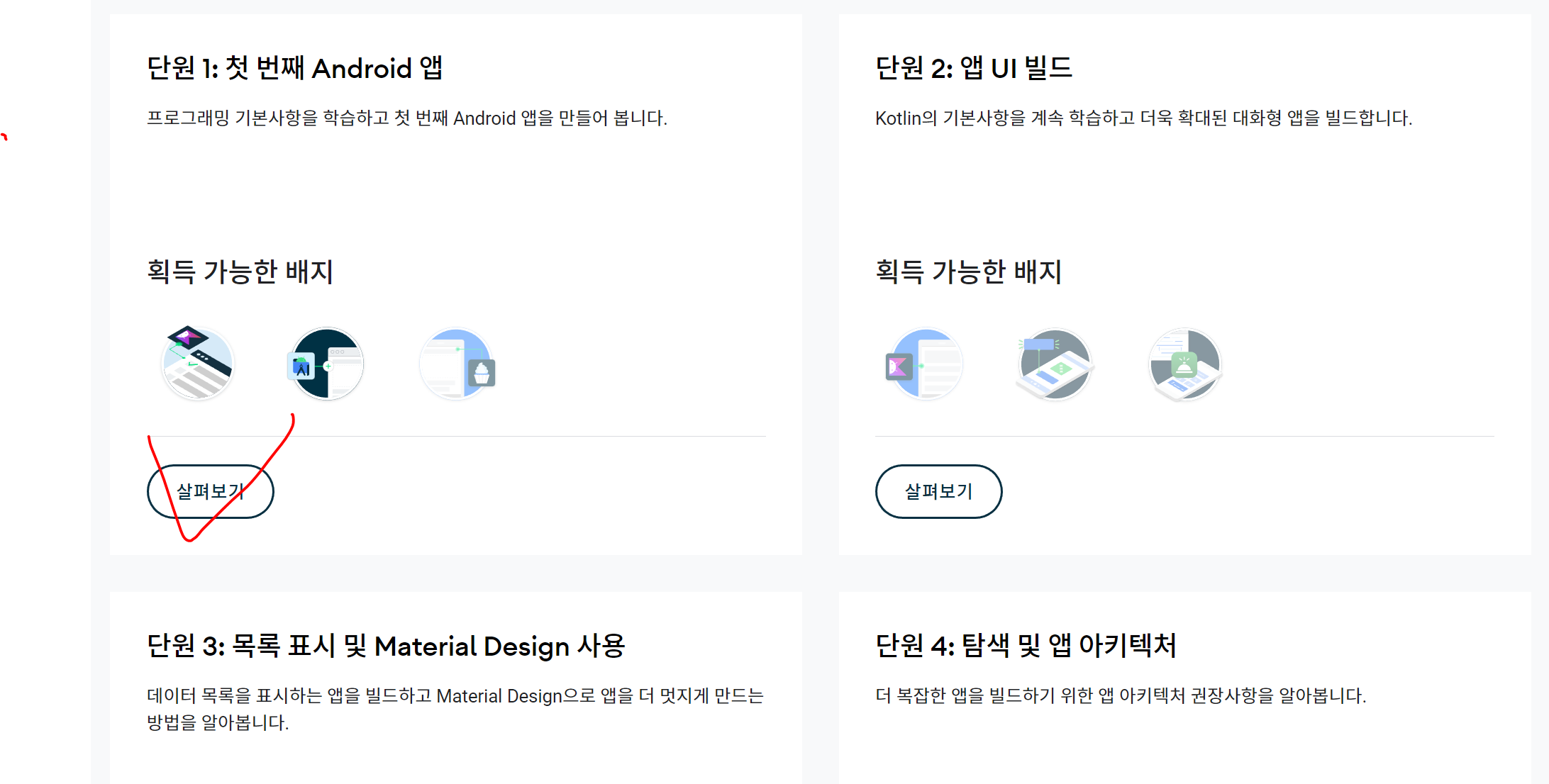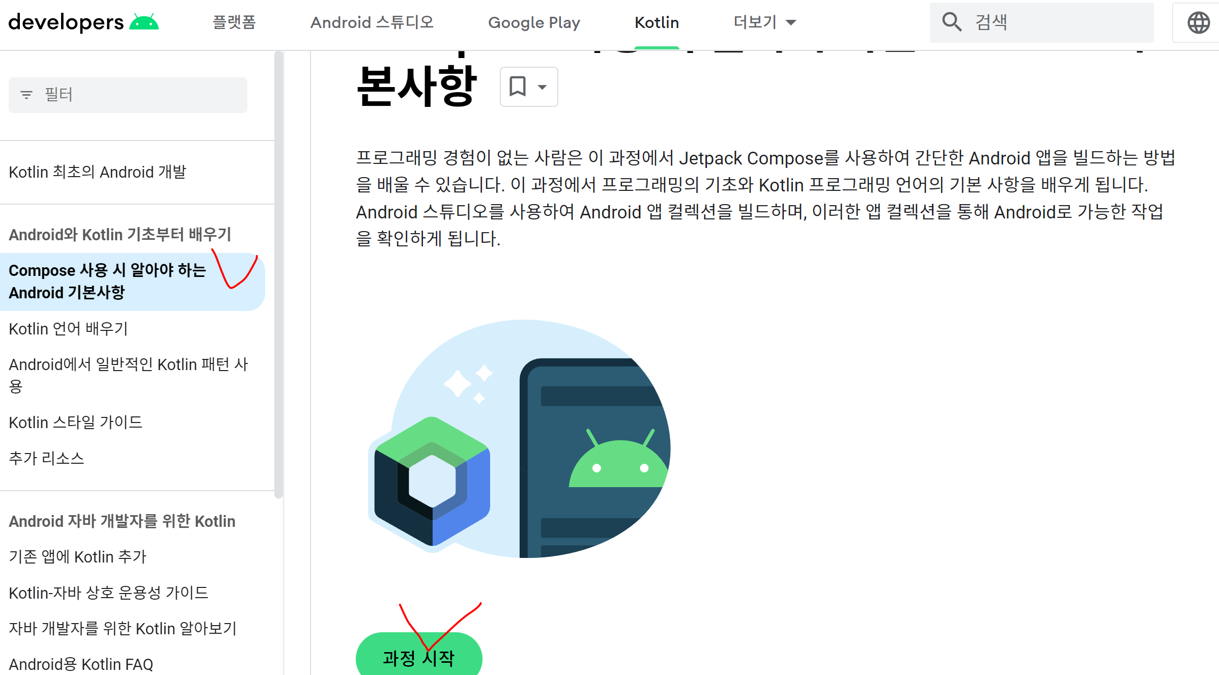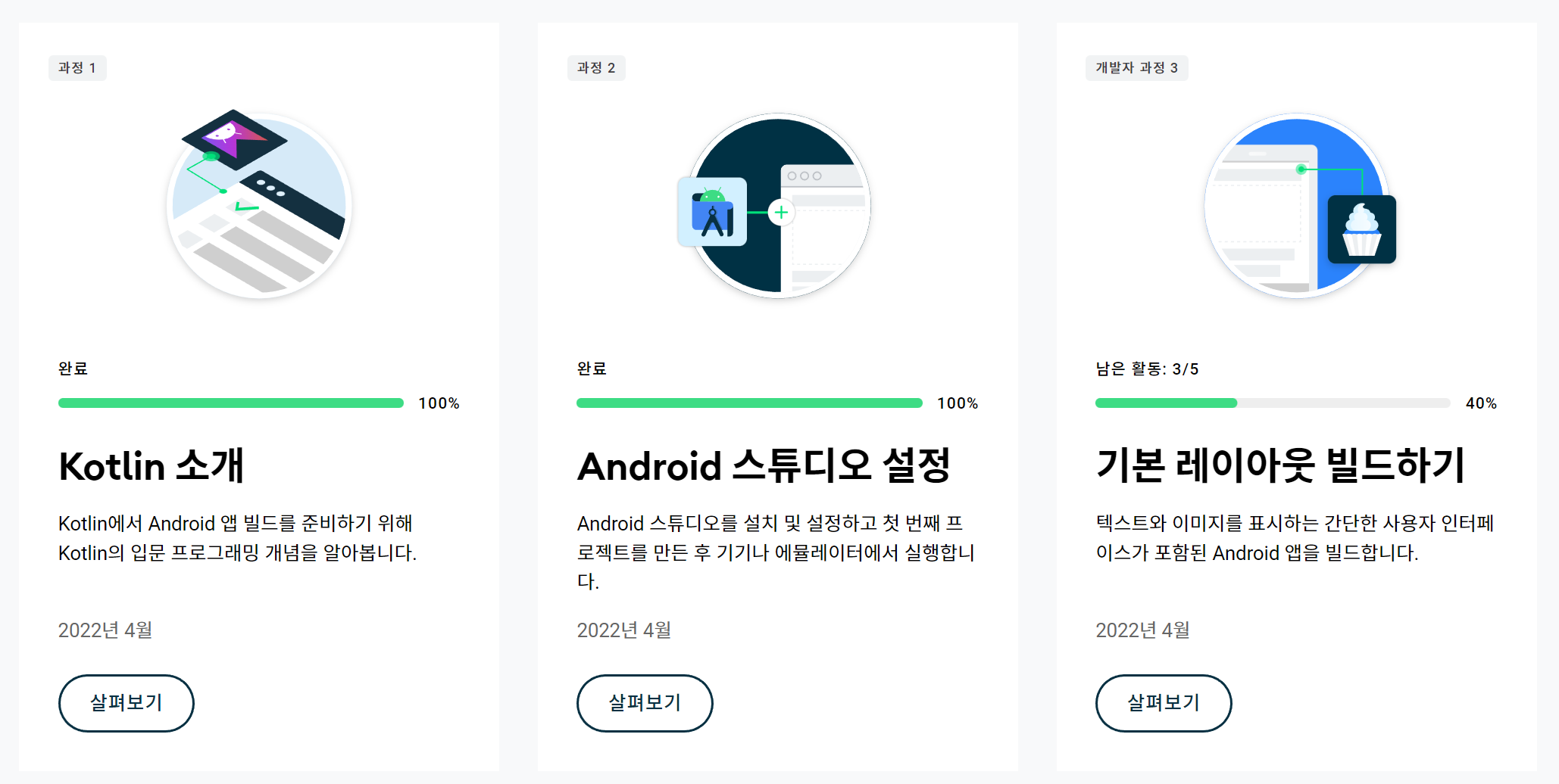 독학으로 앱 만들어보겠다고 말한 지... 거의 1년이 다돼가는 시점... 천천히 조금씩 끝까지 하면 된다고 생각했는데... 나의 착각이었다. 지난 포스팅에 이어서 학습하려고 구글 안드로이드 개발자 사이트에 들어가 보니, 과정이 리뉴얼되어있었다. 그래서, 처음부터 다시 해야 한다. 그래도 희망적인 것은 공부한 개념이 바뀌지는 않았다는 것이다.