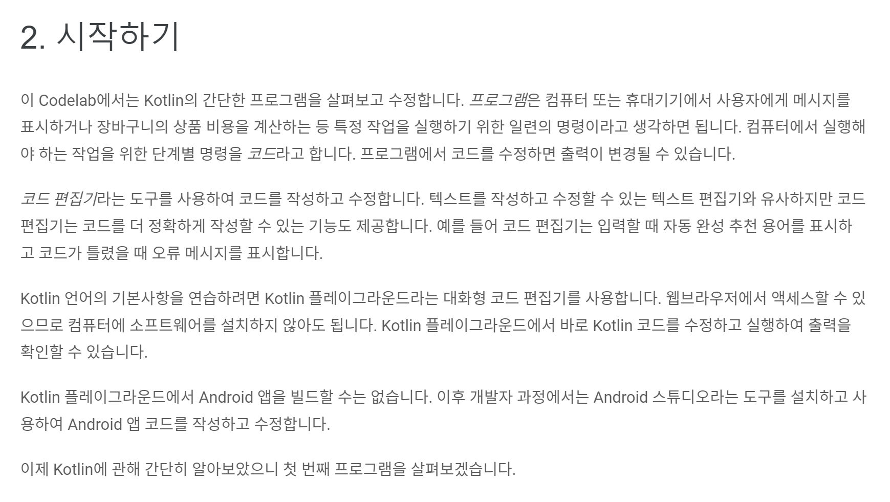목차를 보니, Kotlin에 대해 배우는 거 같다. 이건 공부한 적이 있지만 까먹었으니 이어서 봐본다. 여기서는 간단한 Kotlin 프로그램 작성하고 실행하는 방법과 간단한 예시를 수정해서 익숙하게 만드는 과정을 한다고 되어있다. 슈슈슉 봐보자.