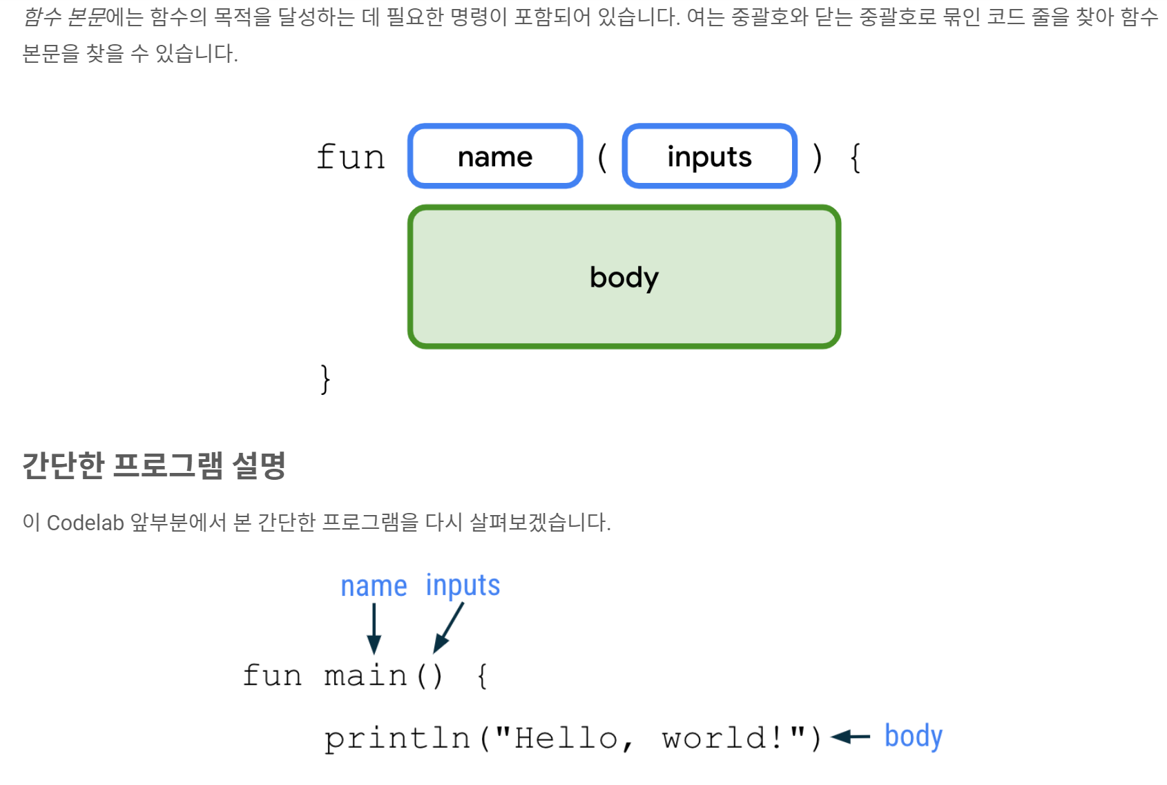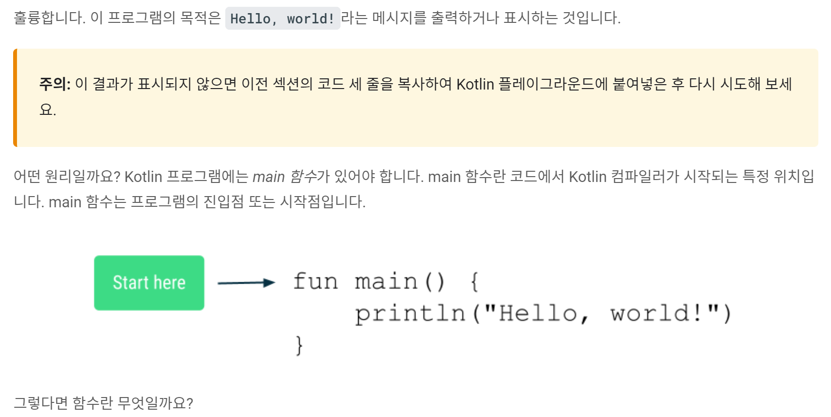 Kotlin 실습을 위해 플레이그라운드라는 웹사이트에 접속하라는 내용이다. 그리고 해당 사이트에 접속했을 때 보이는 코드가 어떤 내용인지 추측해보라고 되어있다. 이건 내가 그냥 설명을 남긴다. fun main()이라고 적혀있는 부분에 fun은 function의 약자로 사람으로 비유하면 행동에 비유할 수 있다. function이라는 것은 하나의 기능을 의미하는데, 손 흔들기. 두 다리로 걷기. 사람이 행동할 때 붙이는 말들처럼 프로그램에서 특정 기능의 이름을 부르기 위해 사용된다. fun 손 흔들기. fun 두 다리로 걷기. 와 같은 형식이다. 그렇다면, fun main은 하나의 기능에 main이라는 이름을 붙인 것인데, 프로그램에서 main은 특정한 의미를 갖는다. 프로그램의 중심점. 시작점으로 이미 약속된 이름이다.