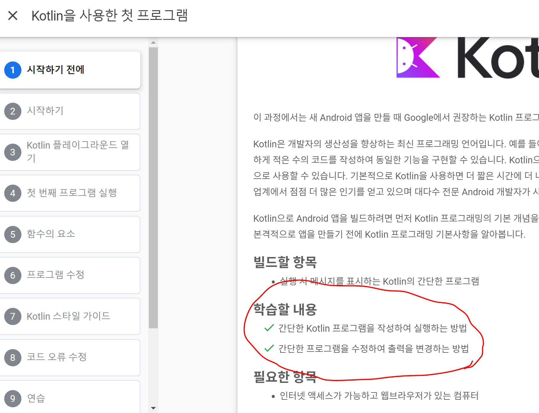 소개는 기본 개념 설명 정도로 슥슥 넘어가 준다. 먼저, 내 관심사에 맞는 교육 과정인지 확인하라는데... 응 관심사 맞아. 하고 넘어가면 되는 거고 2번째 동영상인데 영어니까 바로 걸러준다.... 고 말을 했지만, 혹시 중요한 무언가 놓칠 수도 있으니 영상을 봤으나.. 비추. 한국인에게는 도움 되는 내용이 없었다. 3번째 Kotlin을 사용한 첫 프로그램 과정을 봐보자.