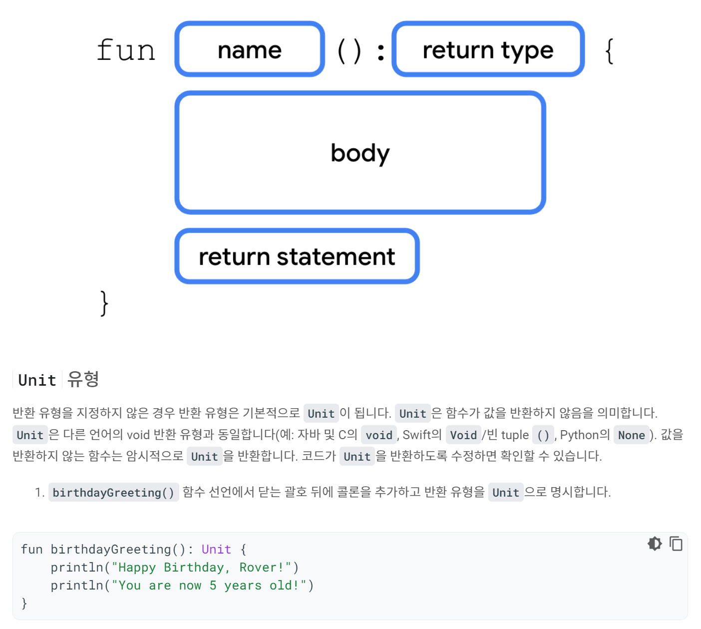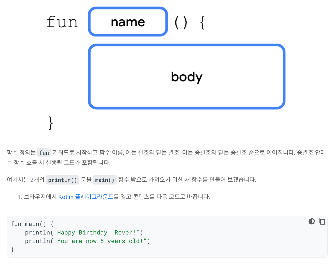 fun 기능 이름 () { 기능 내용 }