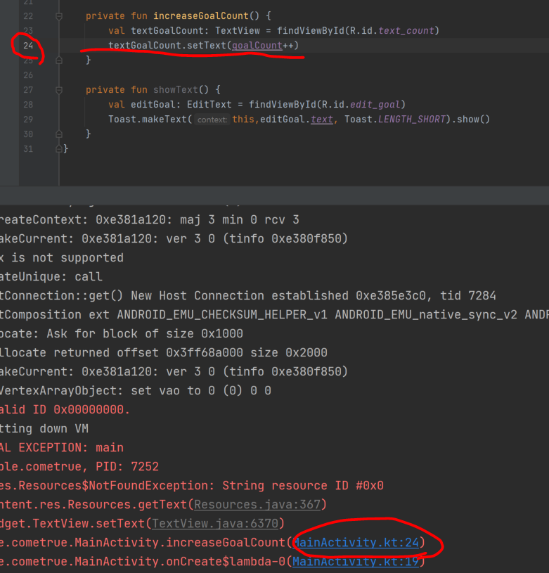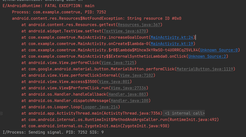 increaseGoalCount() 함수에는 목표를 몇번 썼는지 표시해주는 TextView의 ID값을 불러와서 setText로 goalCount를 넣어줬다. 이렇게 하고 실행을 시켜봤다.... 예상대로 되지 않고 어플이 바로 종료됐다. 그래서 원인을 파악하고자 에러를 확인하였다.