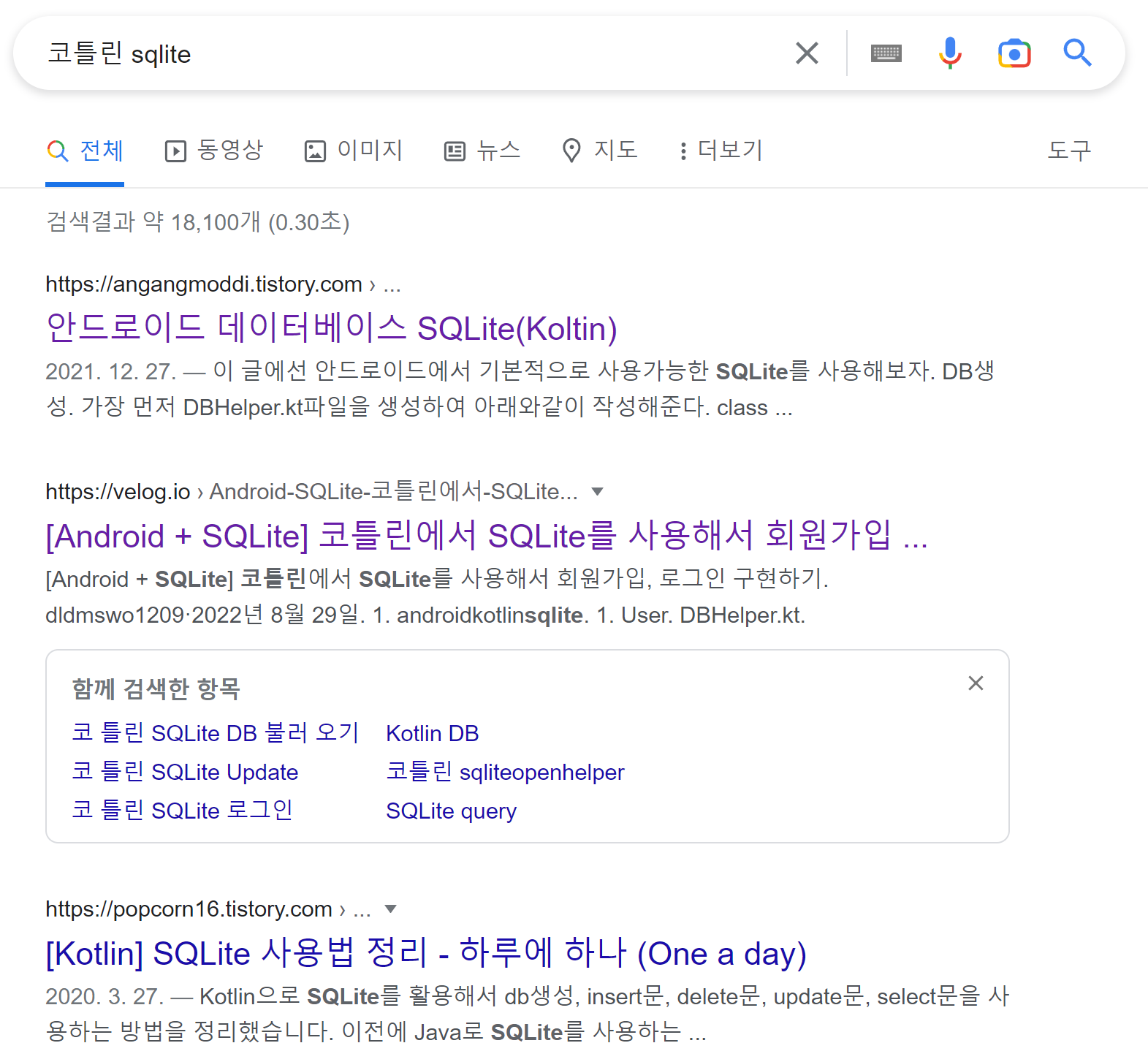 우리가 누구랑 얘기한 내용을 기억하기 위해 달력에 메모를 하거나 종이에 적어야 한다. 프로그램을 만들 때는 DB(Database)라는 것을 이용한다. 깊게 들어가면 여러 가지 많은 내용이 있는데, 안드로이드에서 제공하는 SQLite를 사용하면 우리가 종이에 적어두는 것처럼 우리가 기억하고 싶은 내용을 저장할 수 있다. SQLite 사용하는 방법을 구글링 해본다. 역시나 구선생님은 오늘도 다 알려주신다.