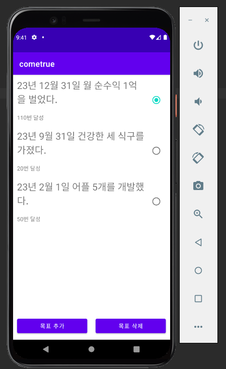이제 보여주는 화면도 만들었으니 다음 글에서는 목표를 추가, 삭제하는 기능을 구현하기 위한 sqlite 데이터베이스 사용에 대해 다뤄보도록 한다.